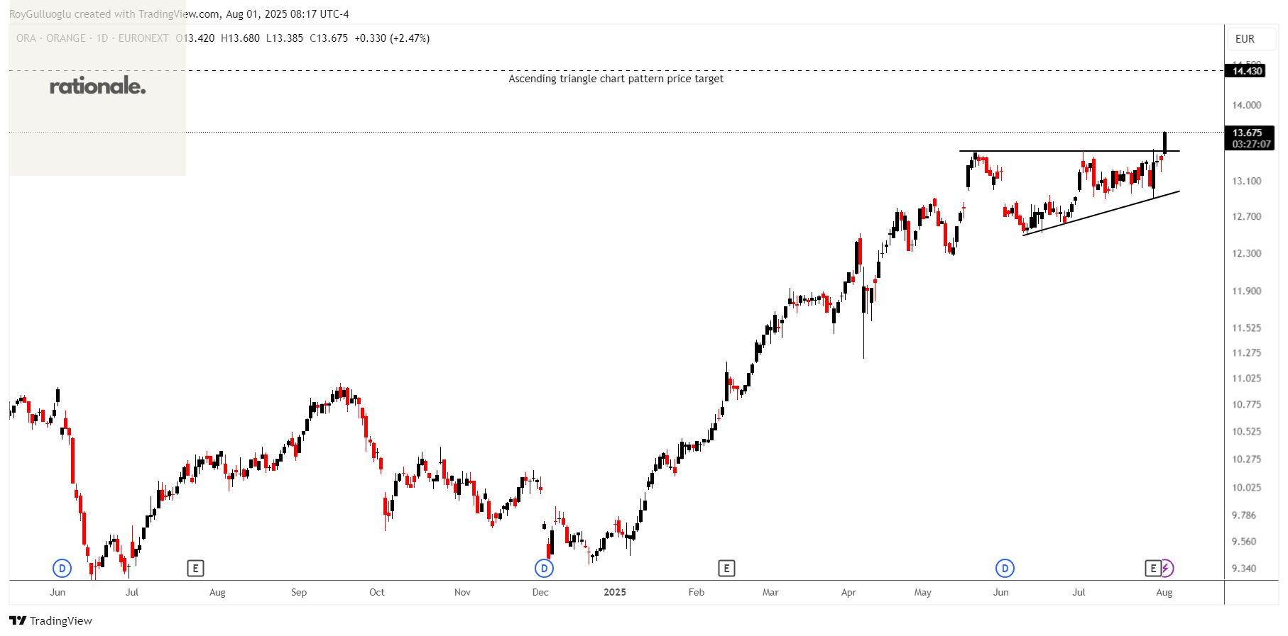 Based on this chart pattern, the potential price target is 14.43 levels.