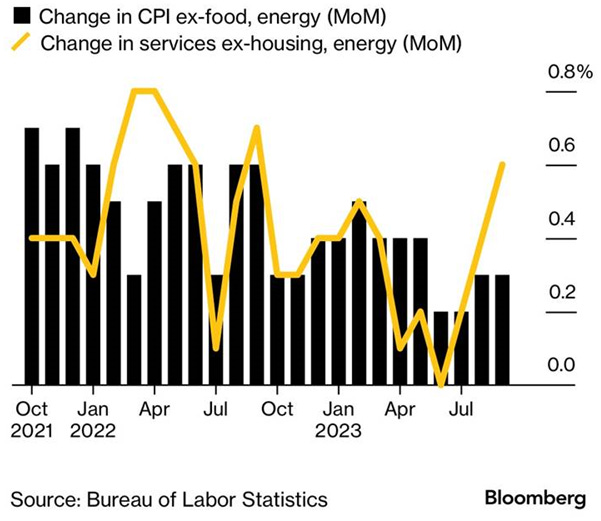 The year-on-year and month-on-month headline inflation exceeded the initial forecasts, but there are positive indications of a slowdown in core inflation. The primary contributing factor to this trend is a 7% year-on-year increase in the shelter segment. If we exclude the shelter component, the index levels off at 2%, aligning with the Federal Reserve's target.