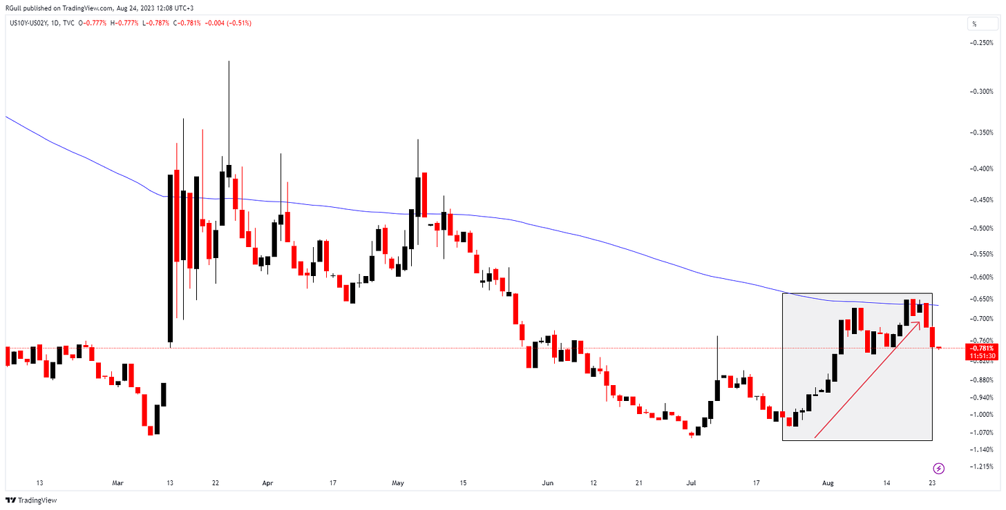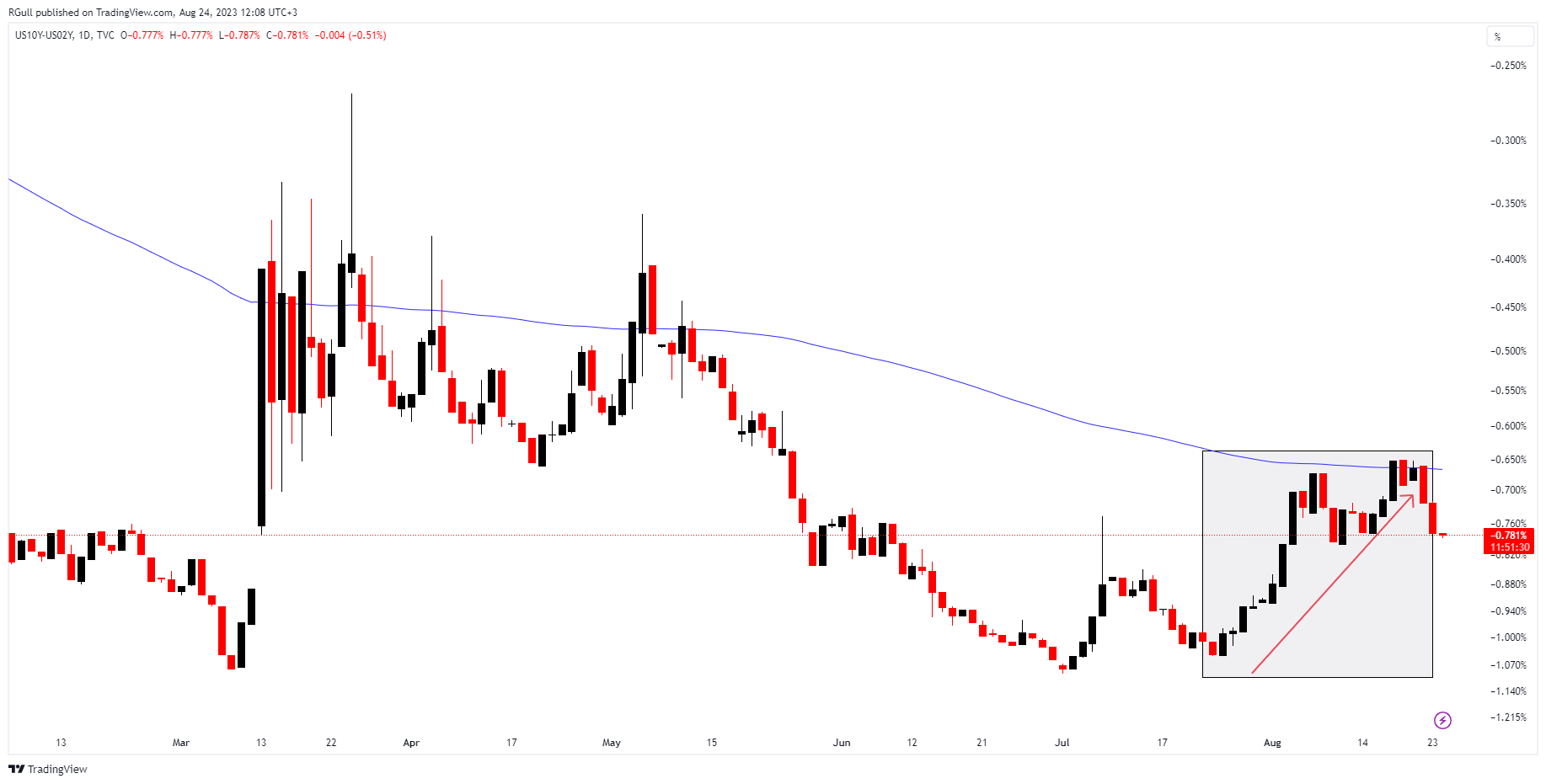 23/08 weak PMI data led to a decline in the market's expectations for a more aggressive Fed rate, reversing the recent uptrend of the yields.