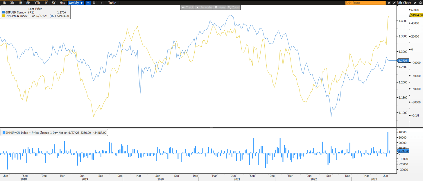 Net non-commercial future positioning which is known as CFTC COT(commitment of traders) data also supports the GBP long positioning. The yellow line below shows the net non-commercial future positioning and the blue line is GBPUSD itself. You can track the way both graphs interact. You can also track COT positions from the blue bars below.
