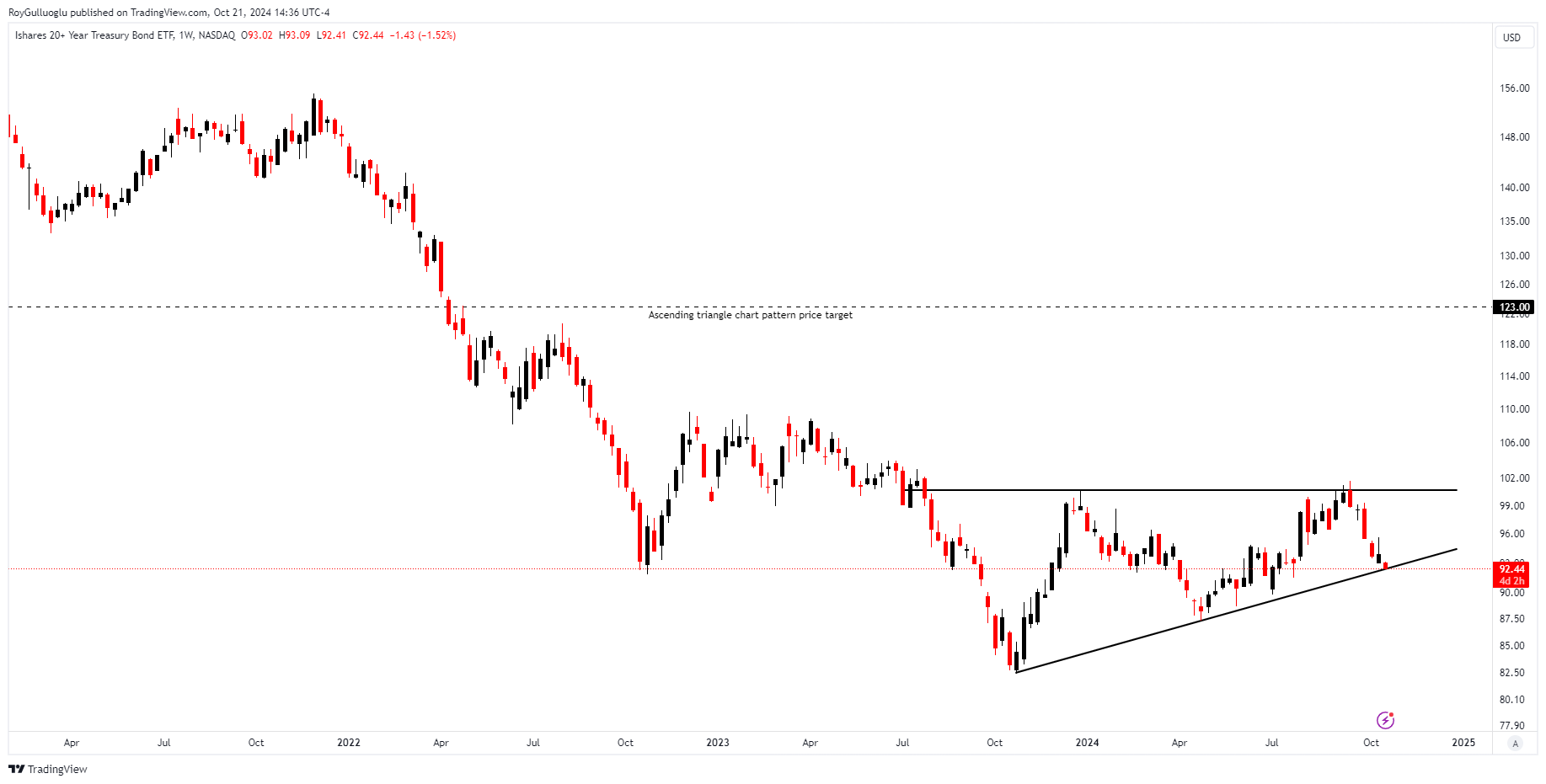 I'm using the TLT chart to track long-term bond yields. It's currently at a crucial technical level—if the trendline acts as a support, we could see a continued decline in yields. Remember that long-term yields go up when the attached TLT chart goes down.