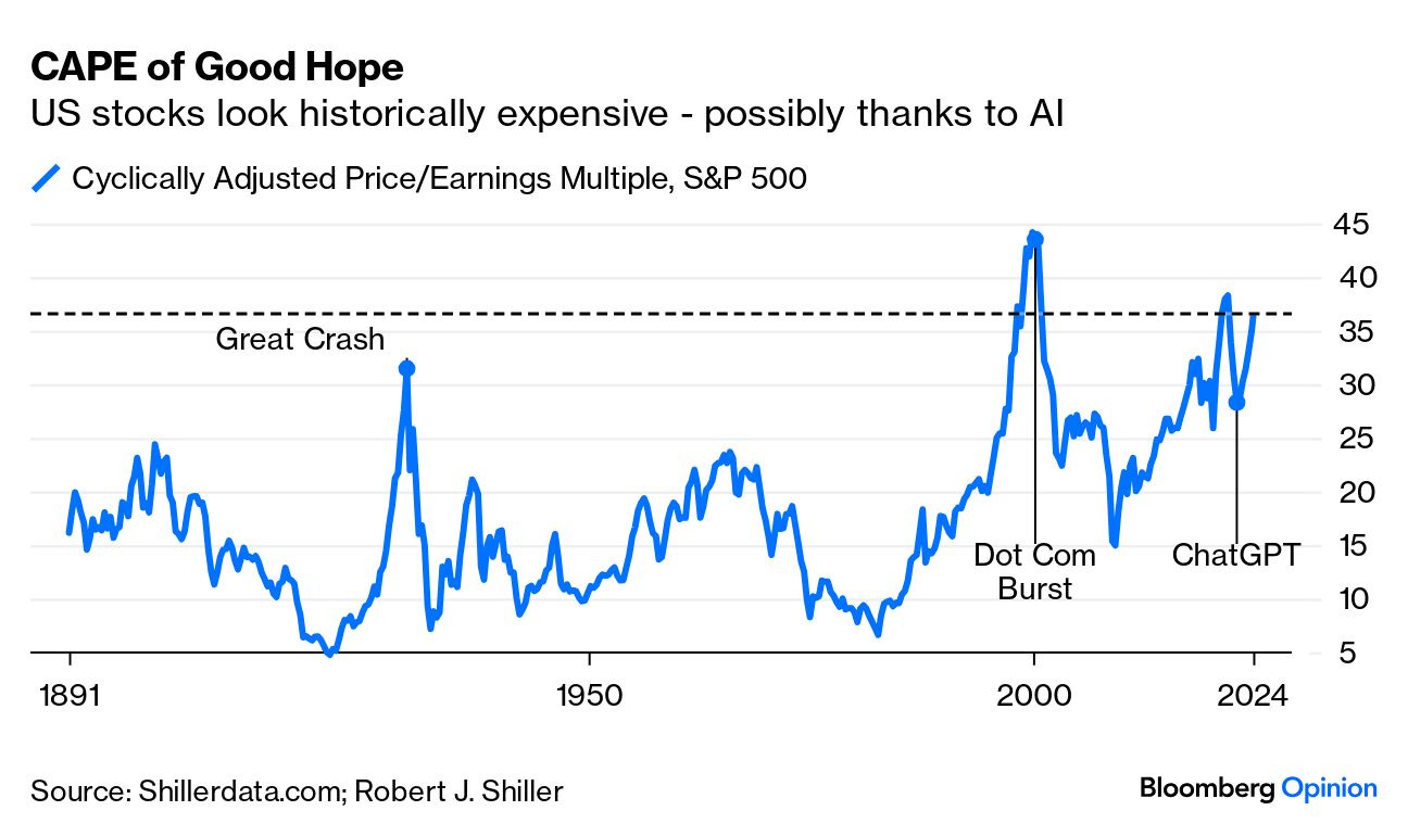 Historically, when the CAPE peaked, it often led to a significant decline over several years, but this time the CAPE peaked in 2021 and bounced back by late 2022—coinciding with the launch of ChatGPT. The ongoing AI boom seems to be playing a major role in keeping the market elevated despite historical trends suggesting a potential downturn.