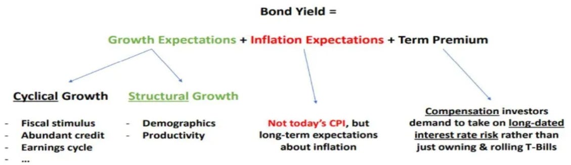 Structural Growth: Long-term economic growth is driven by factors like labor force expansion (positive demographics) and productivity improvements. These support stronger structural growth, leading to higher long-dated bond yields. For example, recent enthusiasm around AI has fueled expectations of significant productivity gains, supporting a narrative of higher structural growth.