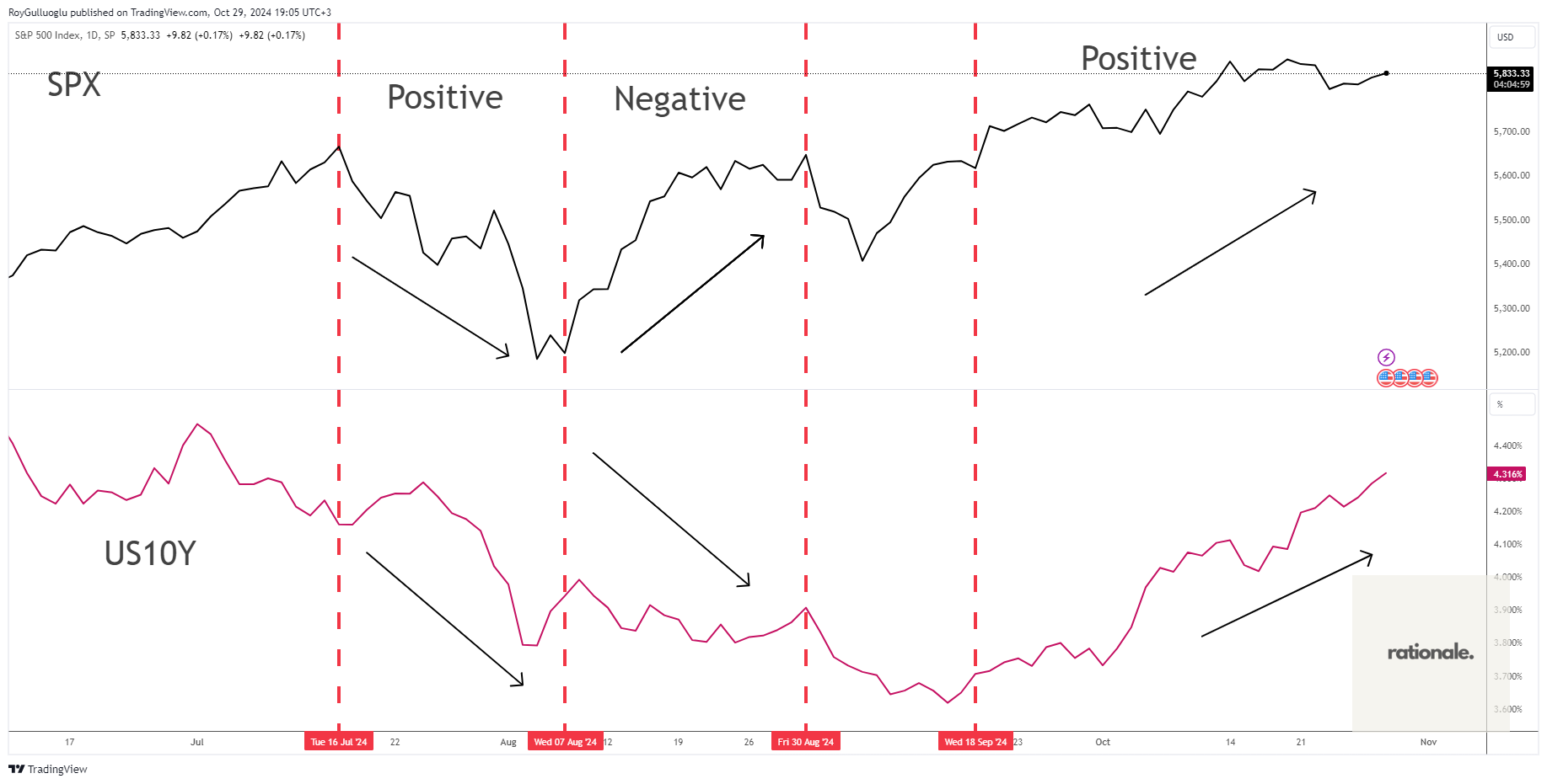 With these factors in mind, remember that higher yields don’t always spell trouble for stocks. Instead, understanding why yields are rising can help us interpret their broader implications. The relationship between the SPX and US 10-year yields varies across each period in the chart, with each period driven by distinct underlying factors. For instance, despite the current election uncertainty pushing yields higher, the stock market remains supported by a strong earnings season and a positive inflation trend (despite the latest CPI data). This aligns with a “soft landing” scenario, which remains the base case for the current market outlook.
