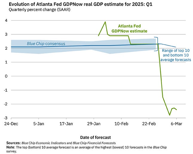 The Atlanta Fed’s Q1 GDPNow estimate turned negative, primarily due to a surge in gold imports widening the trade deficit.