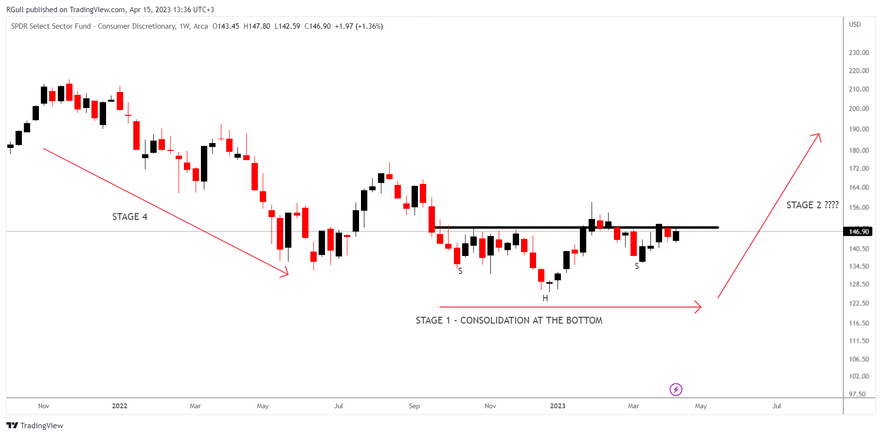 According to GICS, the company is classified under the consumer discretionary sector which generally performs better when the market bottoms. Below you can see XLY-Consumer Discretionary Sector Fund which is establishing a consolidation at the bottom.