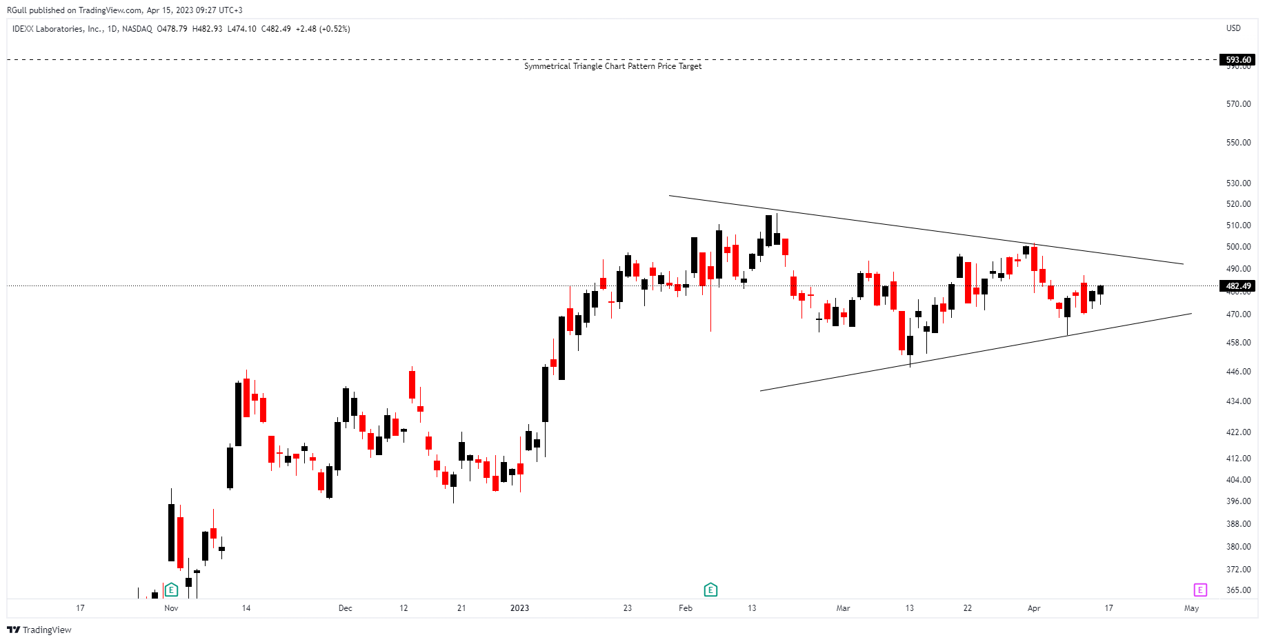The target of a 2-month-long Symmetrical Triangle Chart Pattern is 593.6 level.