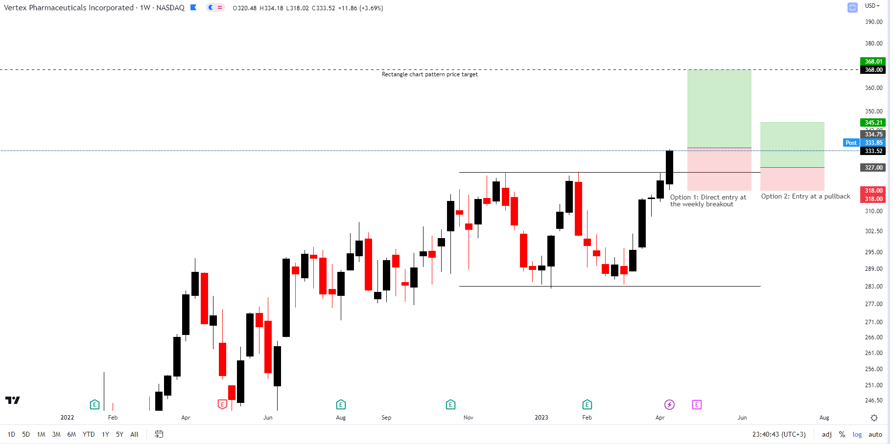Option 1: Direct entry at the weekly breakout → Entry: Active price, Stop Loss Level: 318, Take Profit Level: 368, RR= 1 / 2