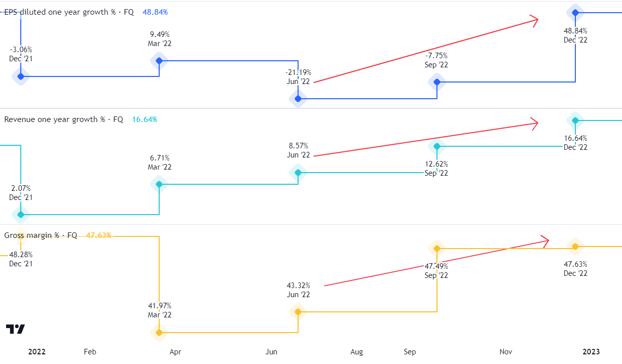 Seeing three-quarters of EPS acceleration on a YoY basis is an important support on the fundamental side. As you can see below, the company has 3 quarters of acceleration in both EPS YoY, Revenue YoY, and Gross Margin YoY.