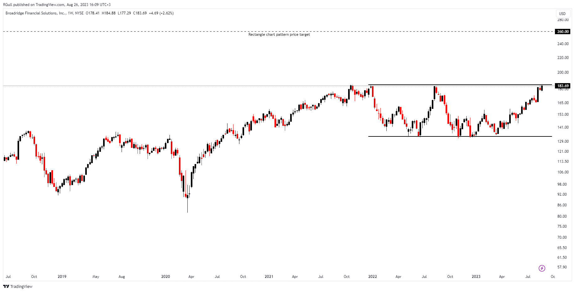 The above weekly chart formed an approximately 20-month-long Rectangle chart pattern as a bullish continuation after an uptrend, with resistance at 185 levels.