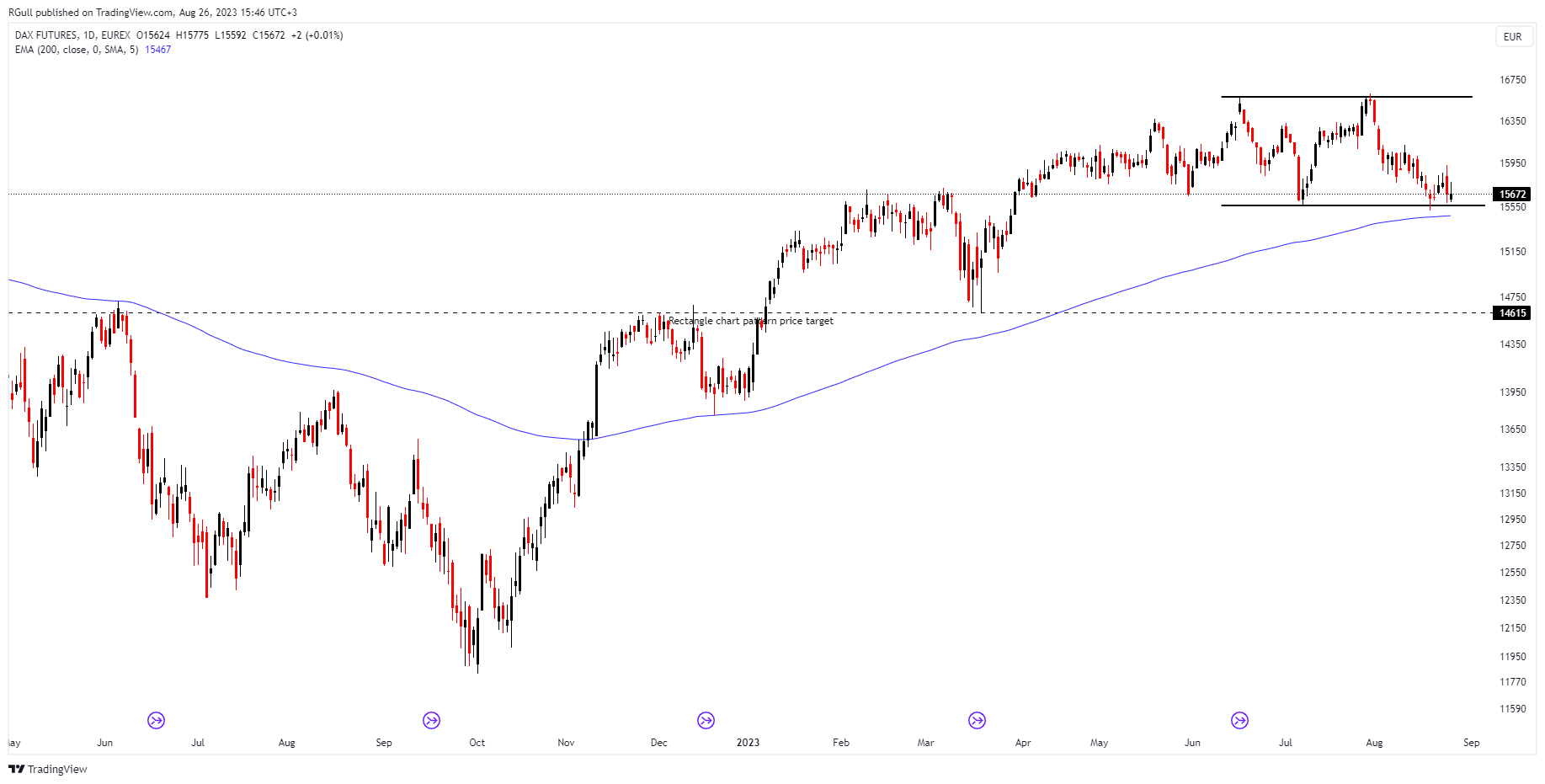 The above daily chart formed an approximately 3-month-long Rectangle chart pattern as a bearish reversal after an uptrend, with support at 15560 levels.