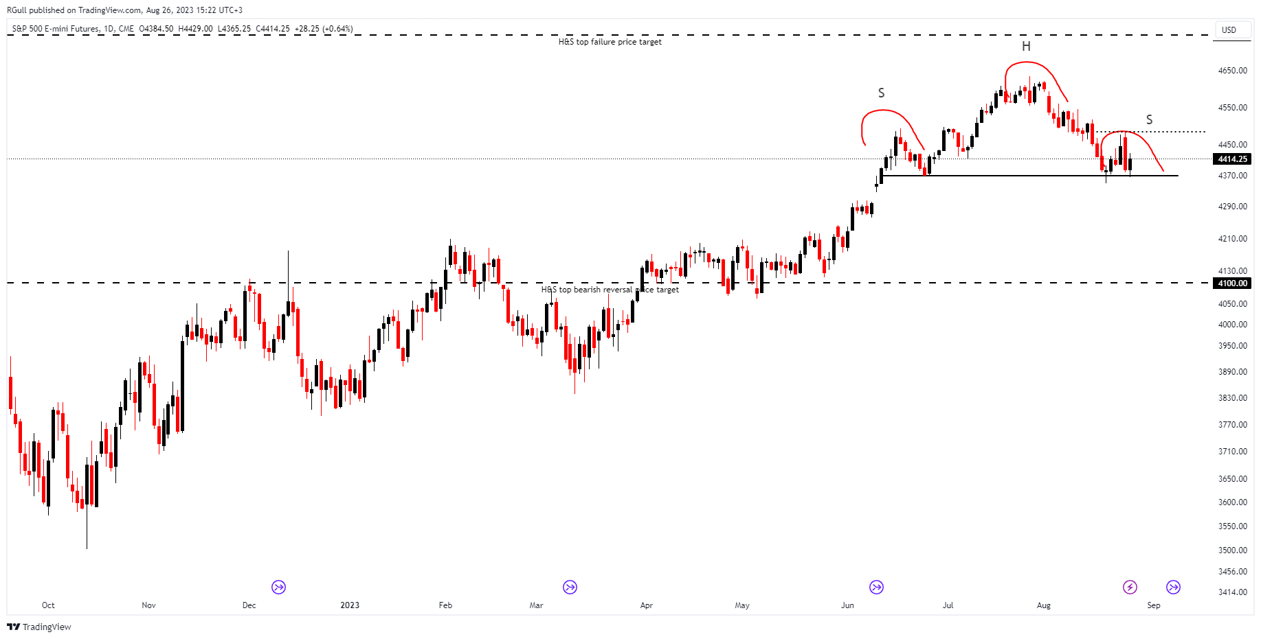 For a bearish reversal scenario, the 4370 neckline level would be crucial and for the failure scenario, the 4485 level should be watched closely as it acts as a resistance on the right shoulder of the chart pattern.