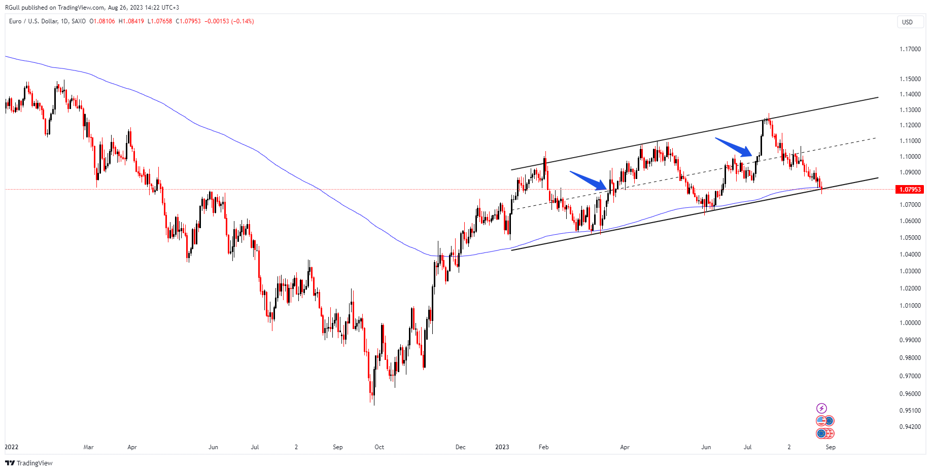 Both the 200-day EMA and the next “higher low” of the channel are around at same 1.08 levels. Seeing a rejection from here wouldn’t surprise me.