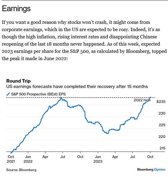 One reason could be the positive expectation of Q4 2023 earnings expectations as stated in the article by John Authers