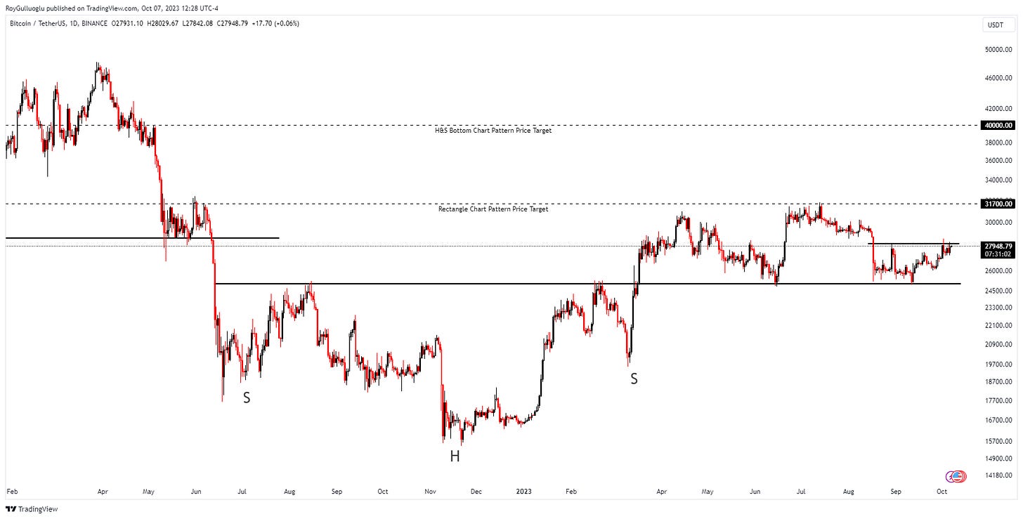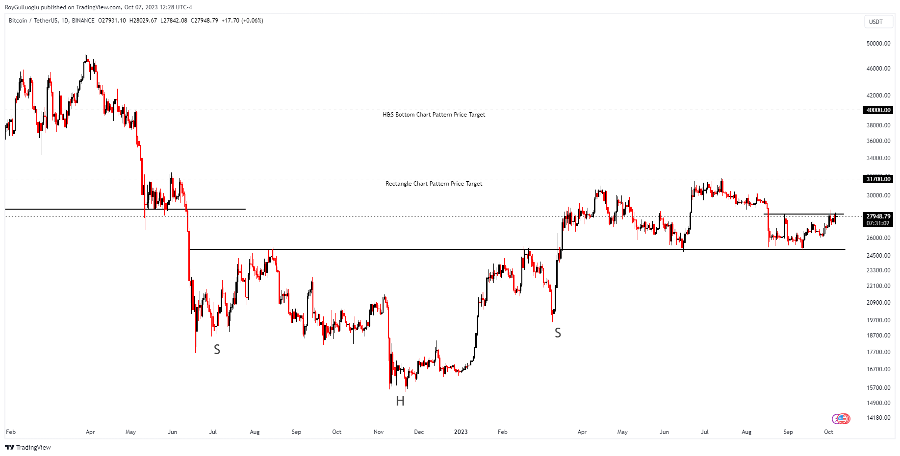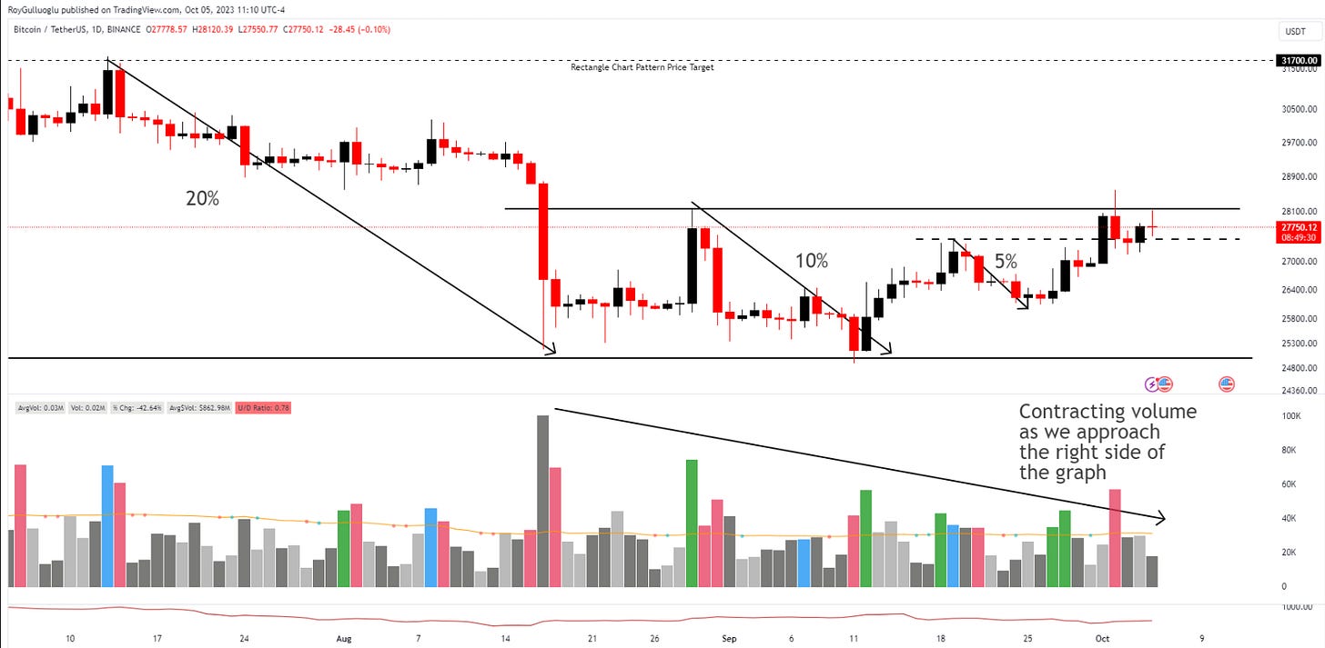 A daily close above 28800$ level would validate the breakout from the Rectangle triangle chart pattern.