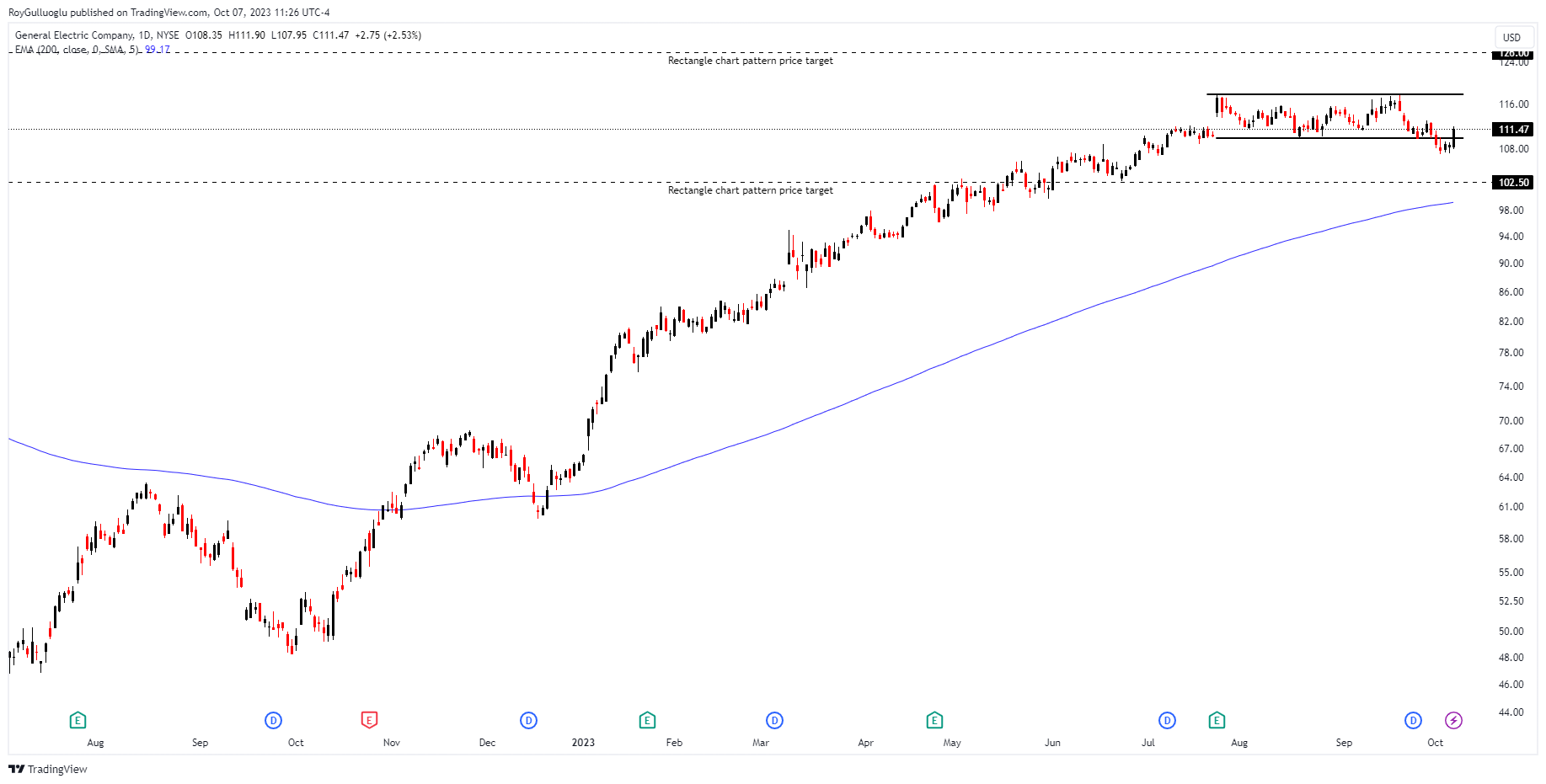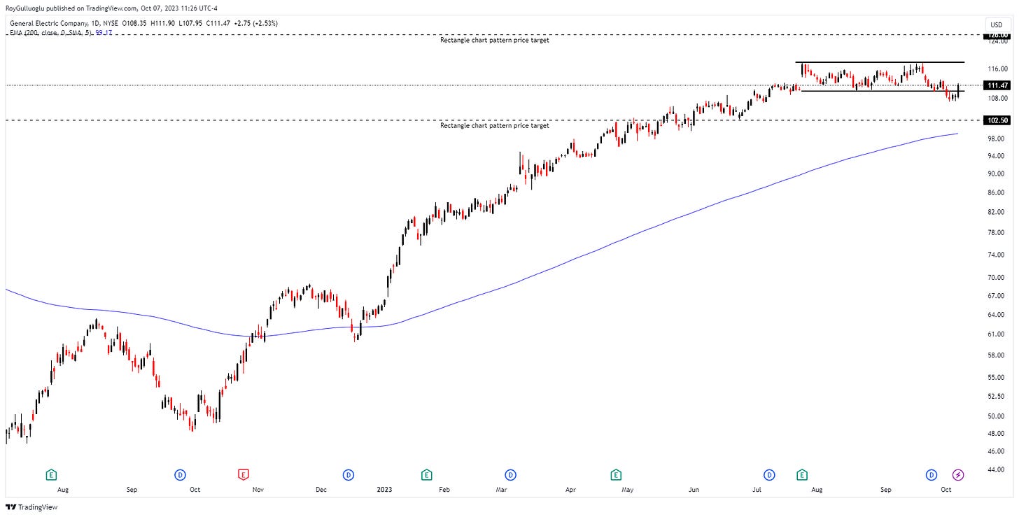 GE is a two-way trade idea depending on the direction of the breakout from the rectangle chart pattern.