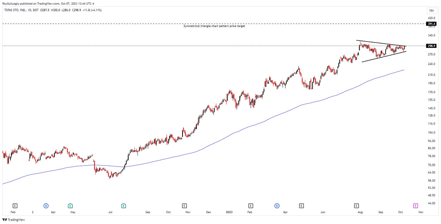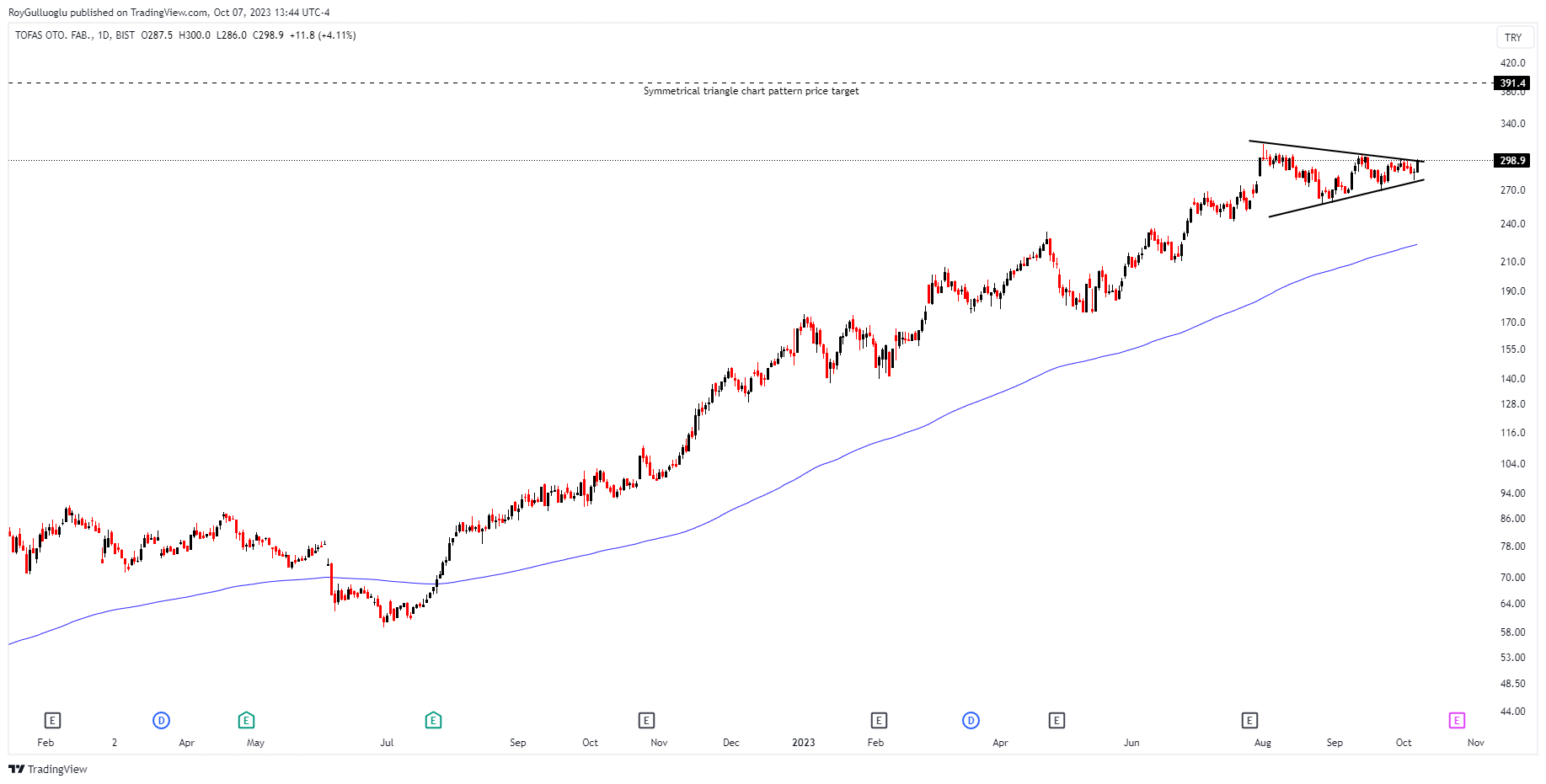 The above daily chart formed an approximately 2-month-long Symmetrical triangle chart pattern as a bullish continuation after an uptrend, with resistance at 299 TRY levels.