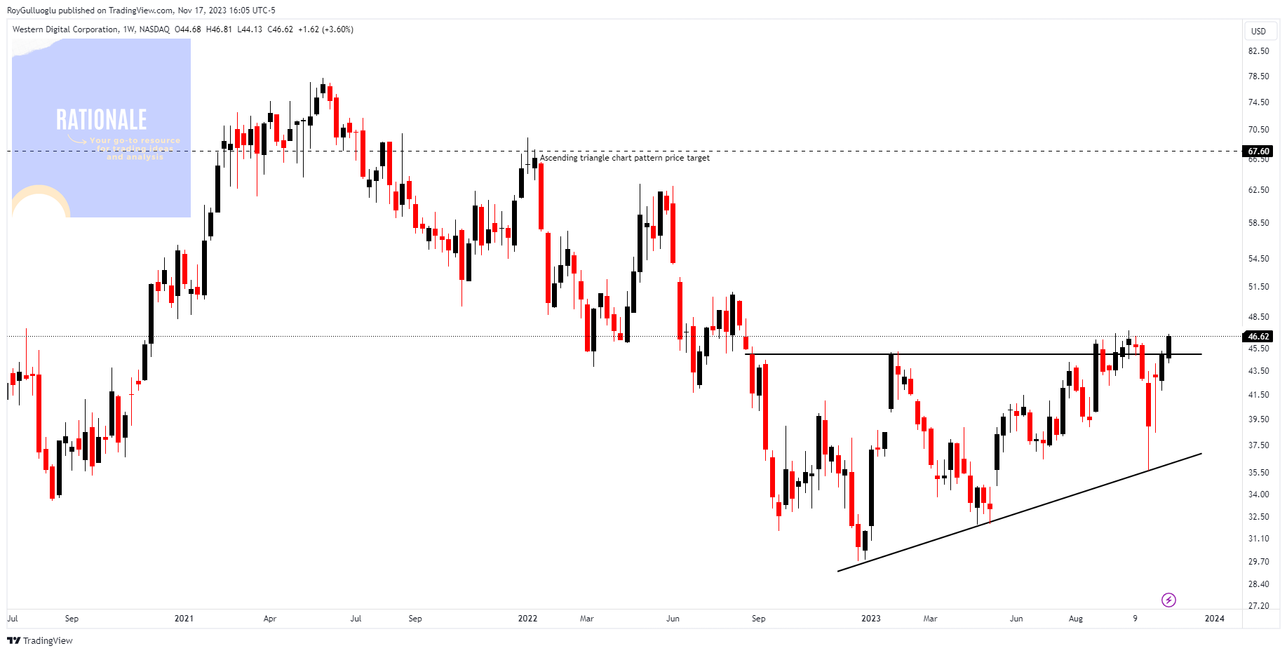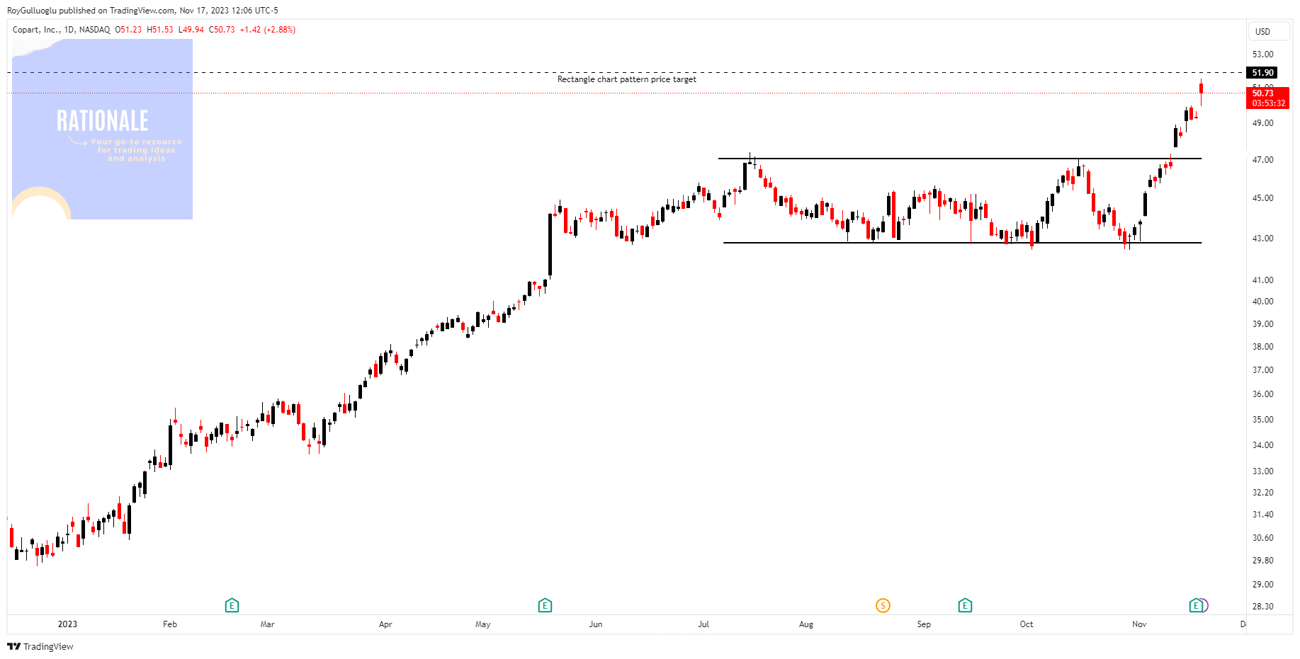 A daily close above 46.35 levels validated the breakout from the 10-month-long ascending triangle chart pattern.