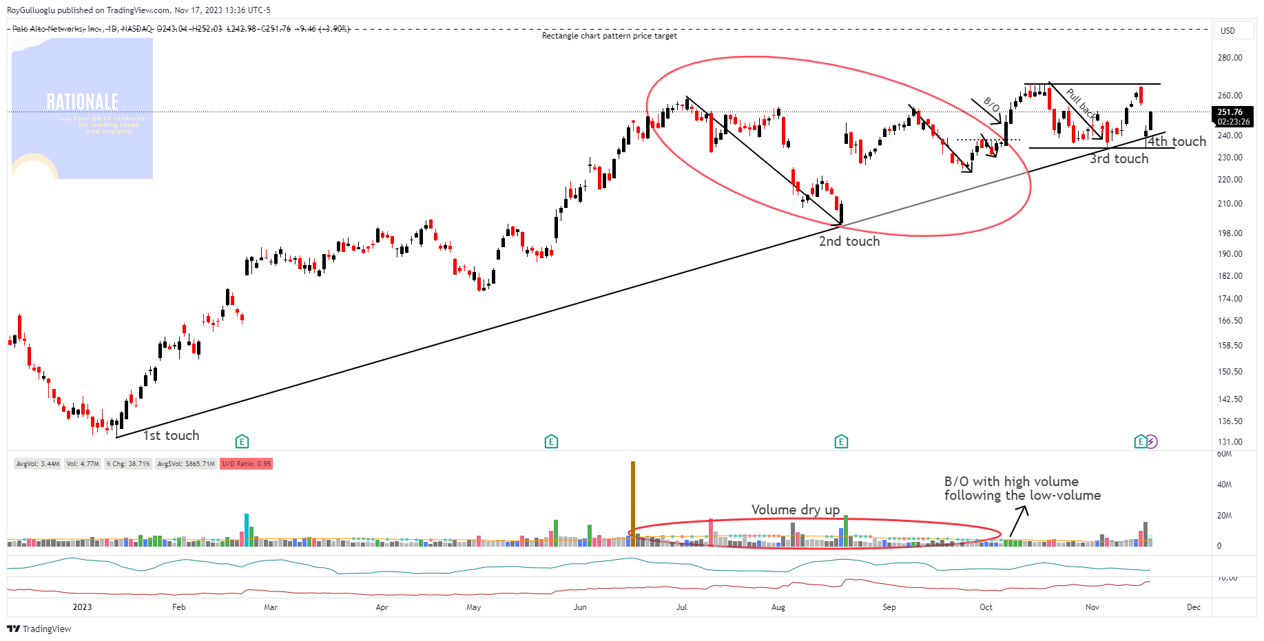 The price broke out after a multiple price contraction as shown in the graph where the volume contraction accompanied, then it got pulled back to the current levels of 240$-245$.