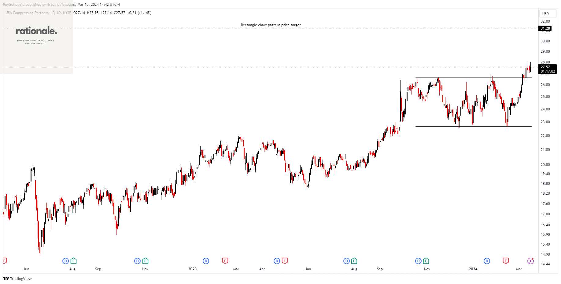 A daily close above 27.45 levels validated the breakout from the 3-month-long rectangle chart pattern.