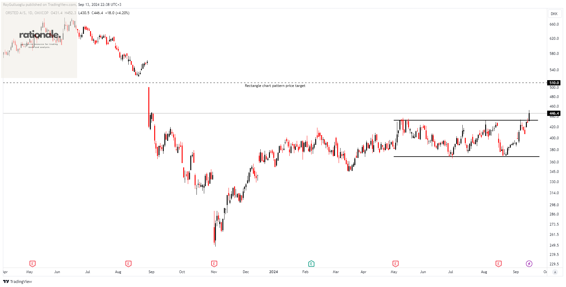 A daily close above 445.27 levels validated the breakout from the 3-month-long rectangle chart pattern.