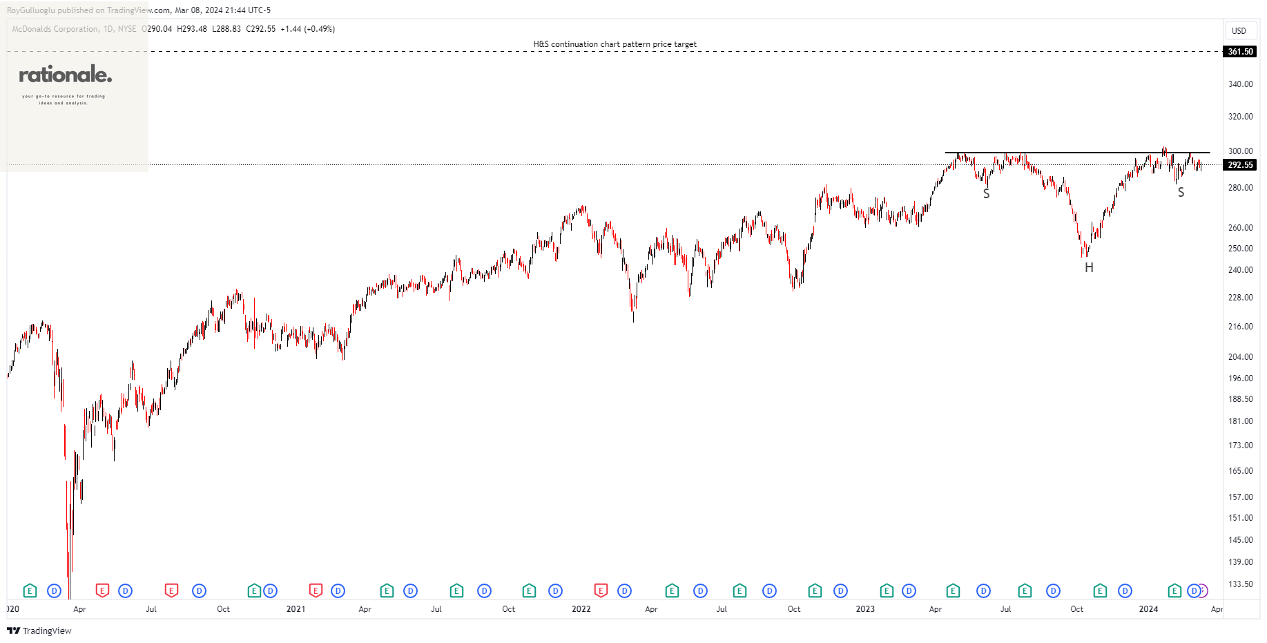 A daily close above 308 levels would validate the breakout from the 6-month-long H&S continuation chart pattern.