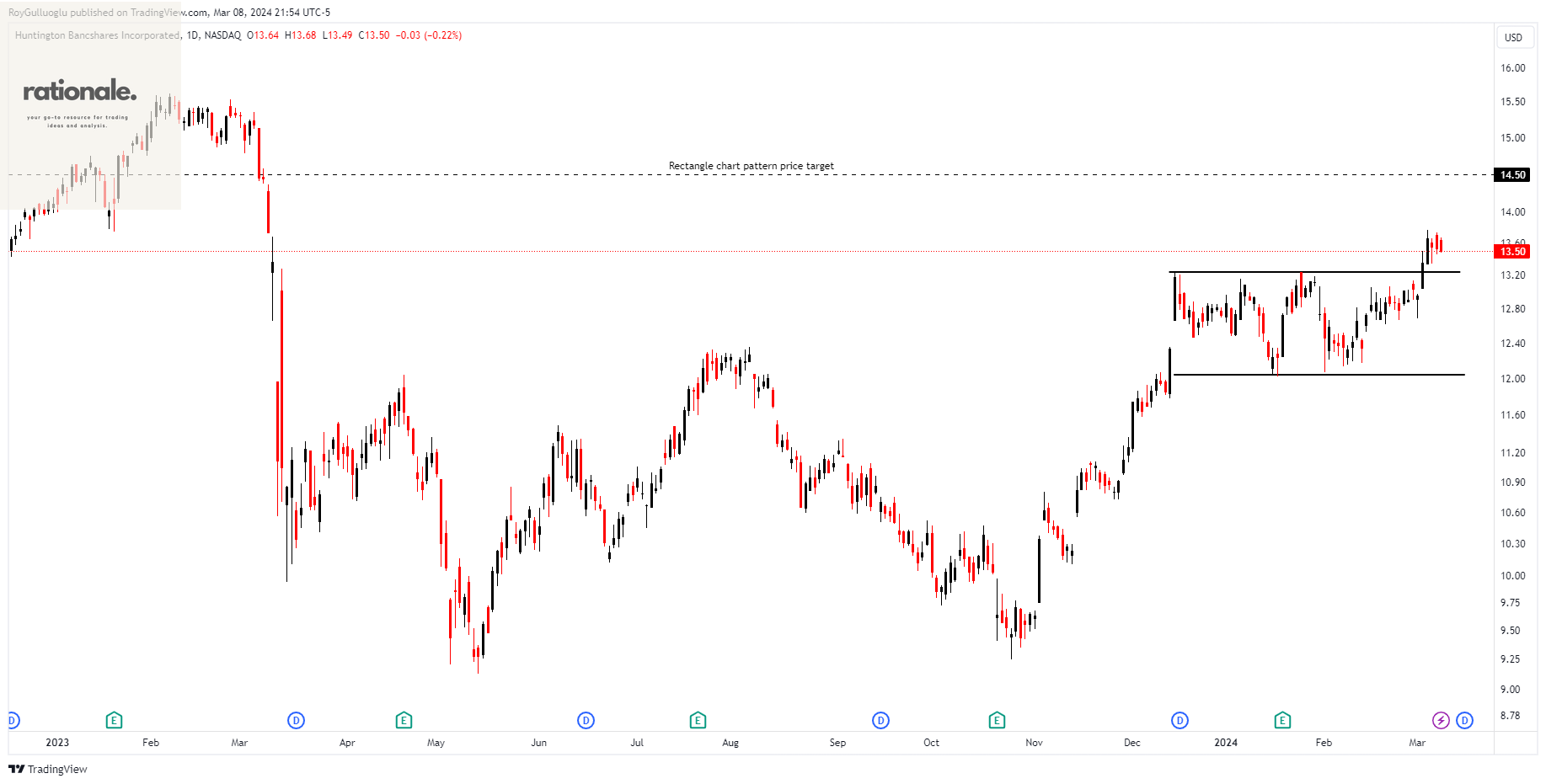 A daily close above 13.63 levels validated the breakout from the 2-month-long rectangle chart pattern.