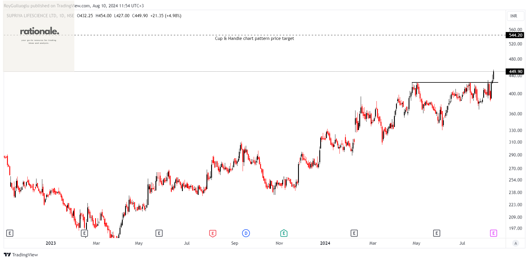 A daily close above 436.72 levels validated the breakout from the 2-month-long cup & handle chart pattern.