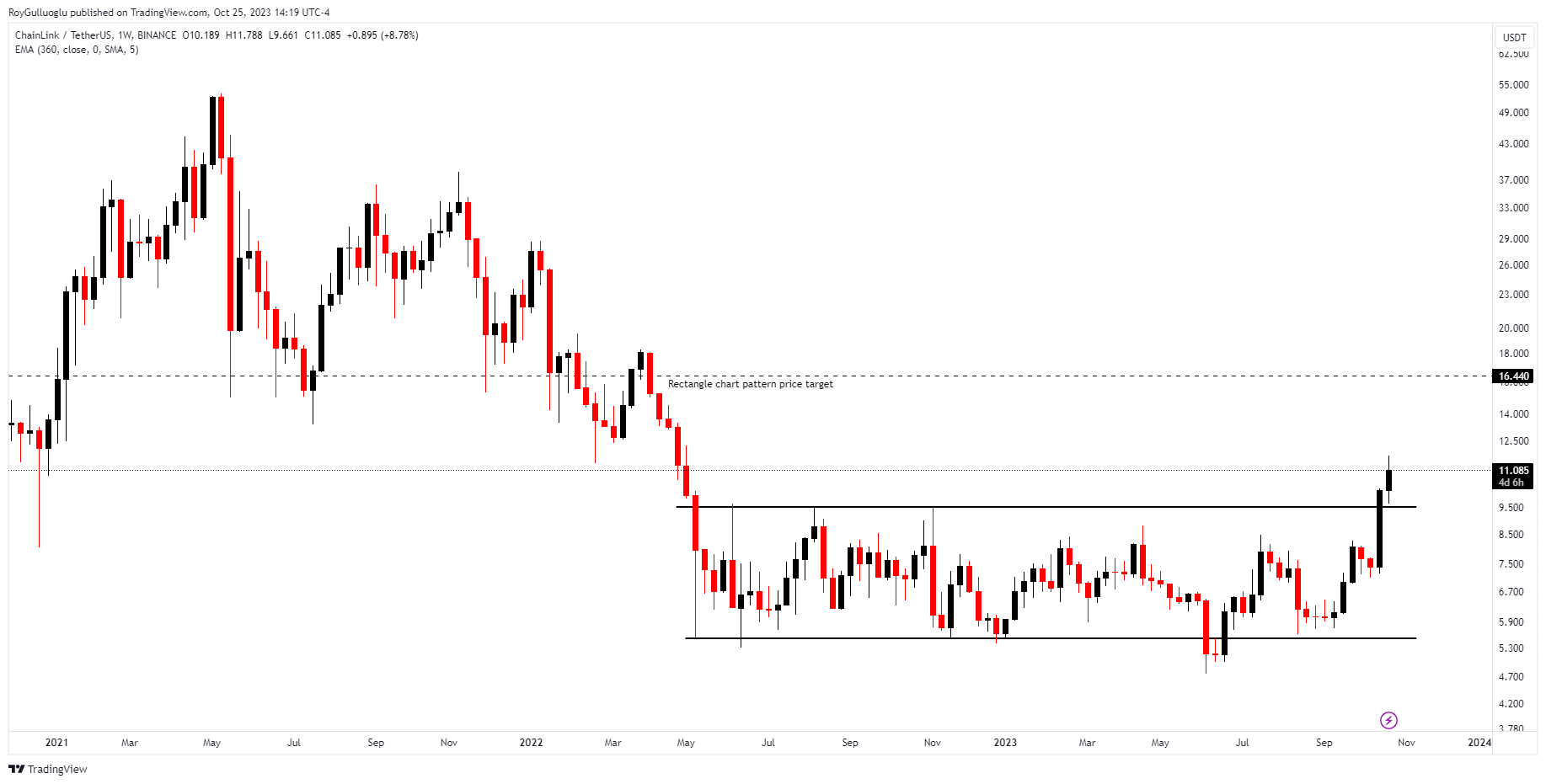 A daily close above 10 levels validated the breakout from the 1.5-year-long rectangle chart pattern.