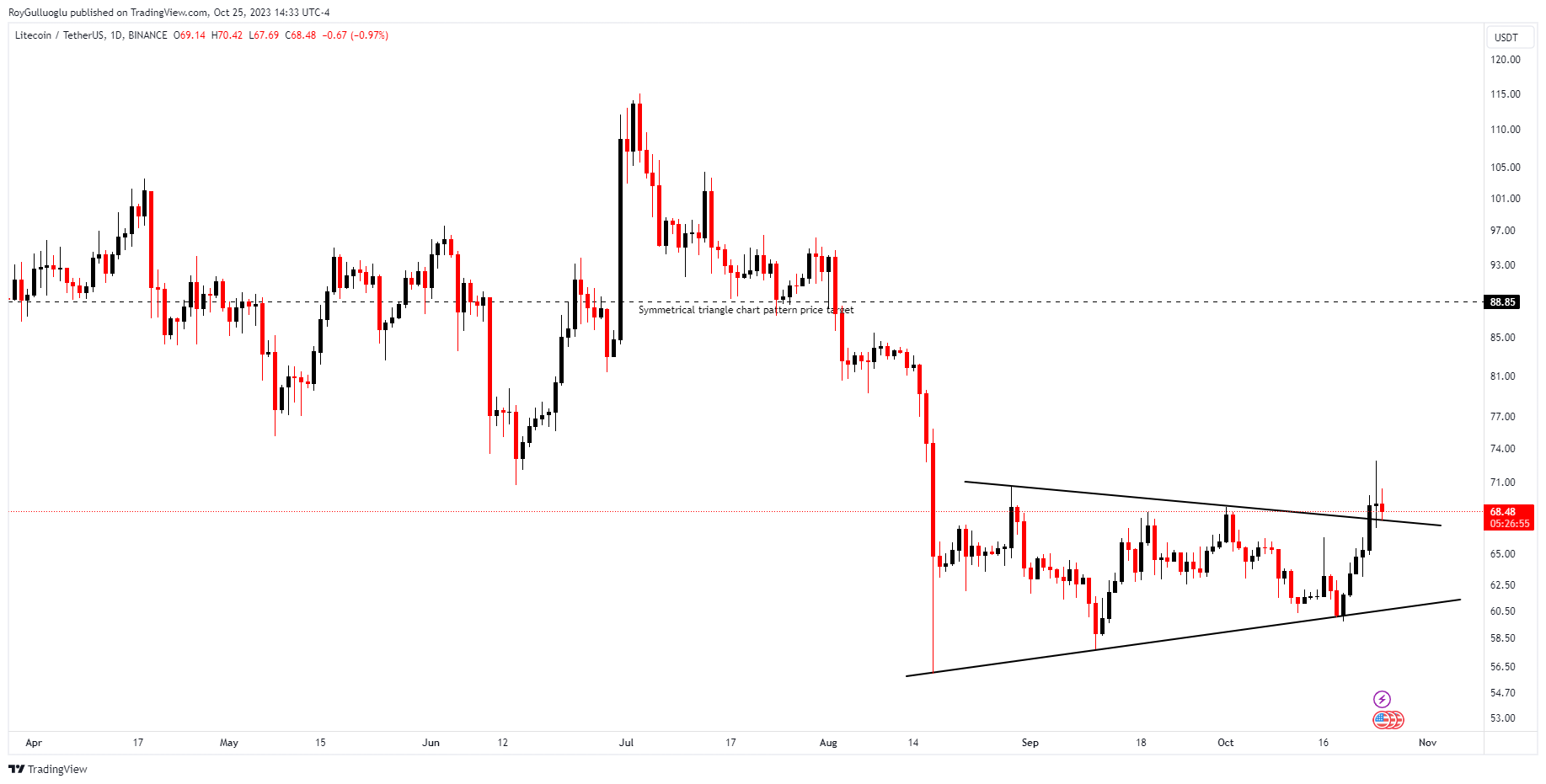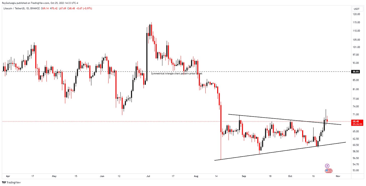 A daily close above 70.3 levels would validate the breakout from the 2-month-long symmetrical triangle chart pattern.