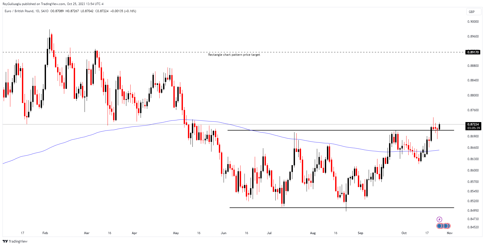 Monitoring the strength of a potential daily close above the 0.87 resistance level.