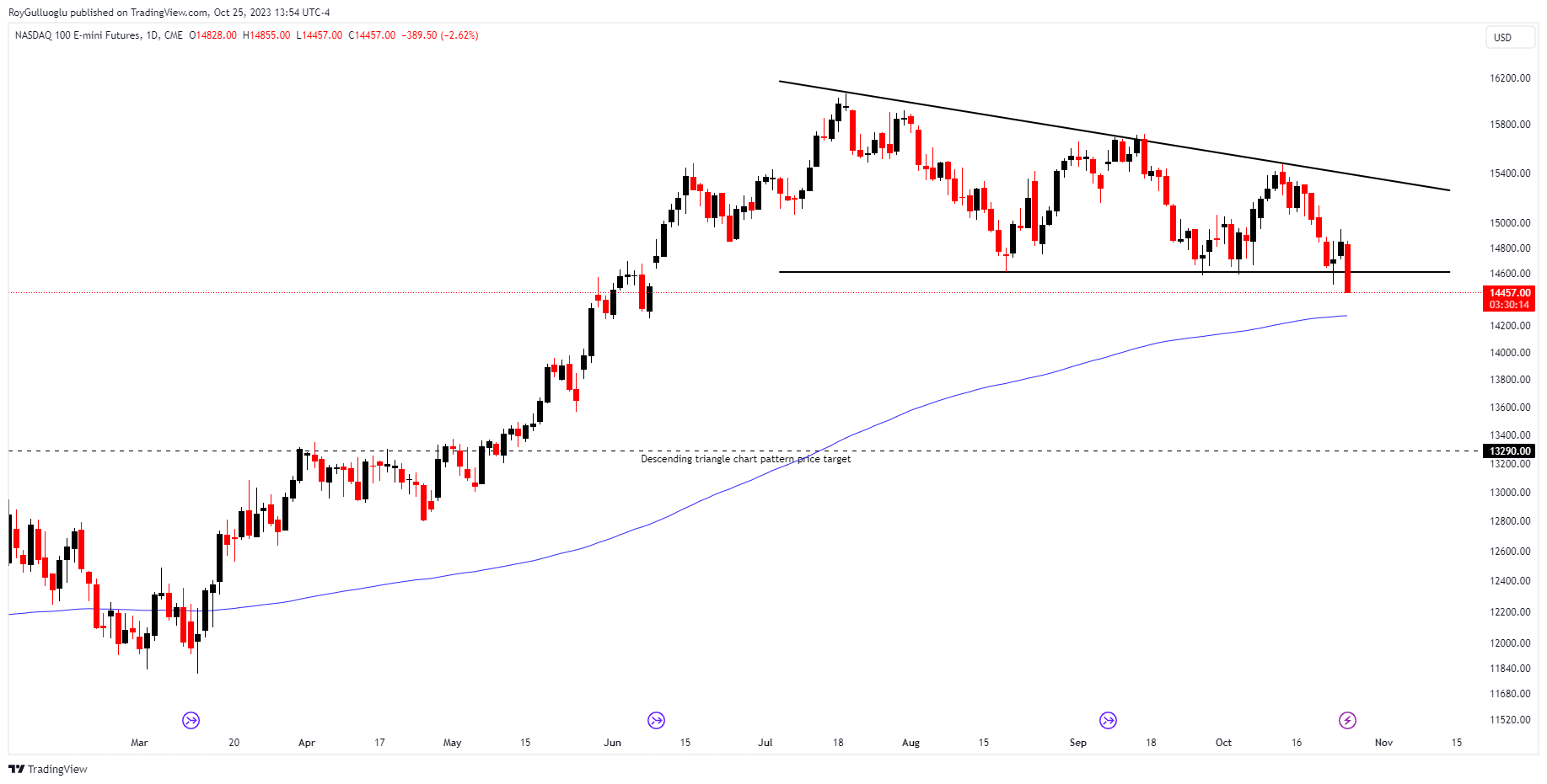 Monitoring the strength of a potential daily close below the 14610 resistance level.