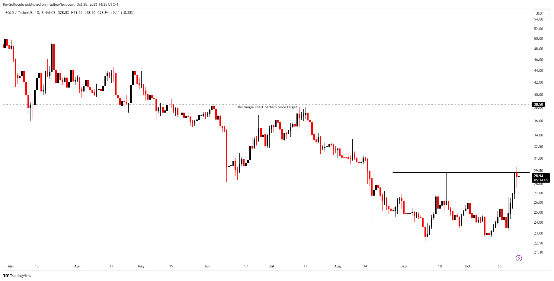 A daily close above 30.9 levels would validate the breakout from the 1.5-year-month rectangle chart pattern.