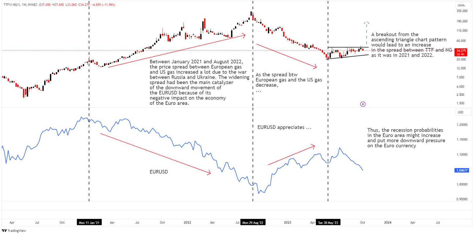 Basically, this trade idea suggests that to take a long position on the spread between the TTF(European natural gas-Title Transfer Facility, a natural gas hub in the Netherlands) and NG (US natural gas), one should buy the same nominal value of TTF while simultaneously selling NG. This strategy essentially might act as a derivative of being short on EURUSD, implying that movements in the TTF and NG spread can serve as an indicator or predictor of changes in the EURUSD exchange rate. In essence, it's a way to benefit from the relationship between these energy markets and currency fluctuations.