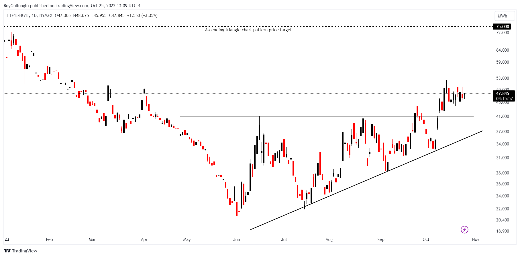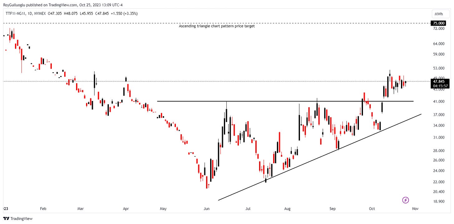 A daily close above 44.18 levels validated the breakout from the 3-month-long ascending triangle chart pattern.