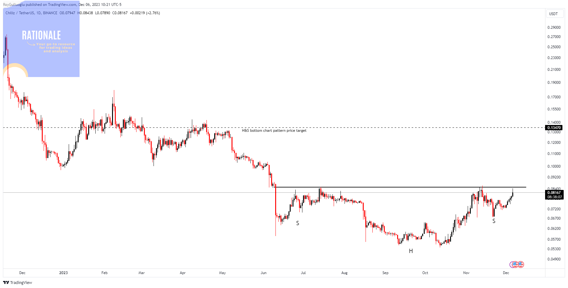 A daily close above 0.08755 levels would validate the breakout from the 6-month-long H&S bottom chart pattern.