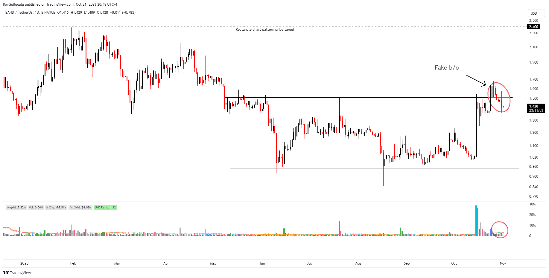 The observed price decrease marked with a circle, accompanied by lower-than-average negative volume, suggests that there is no evidence of an oversupply. It may be worthwhile to consider re-entering the market if a new breakout occurs.