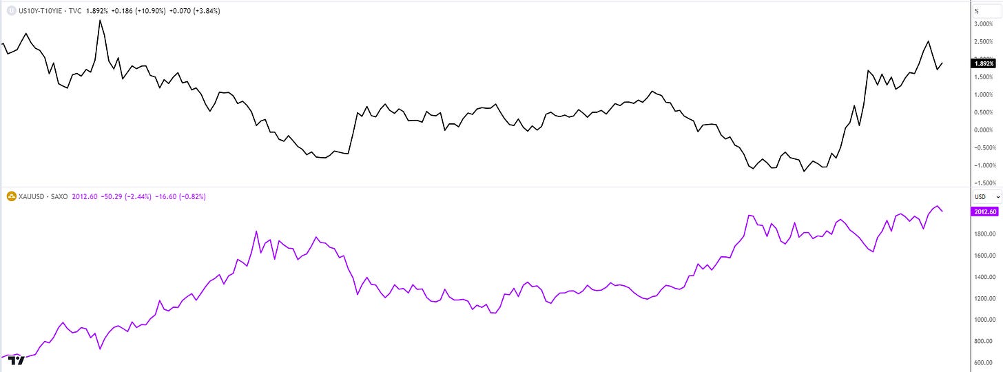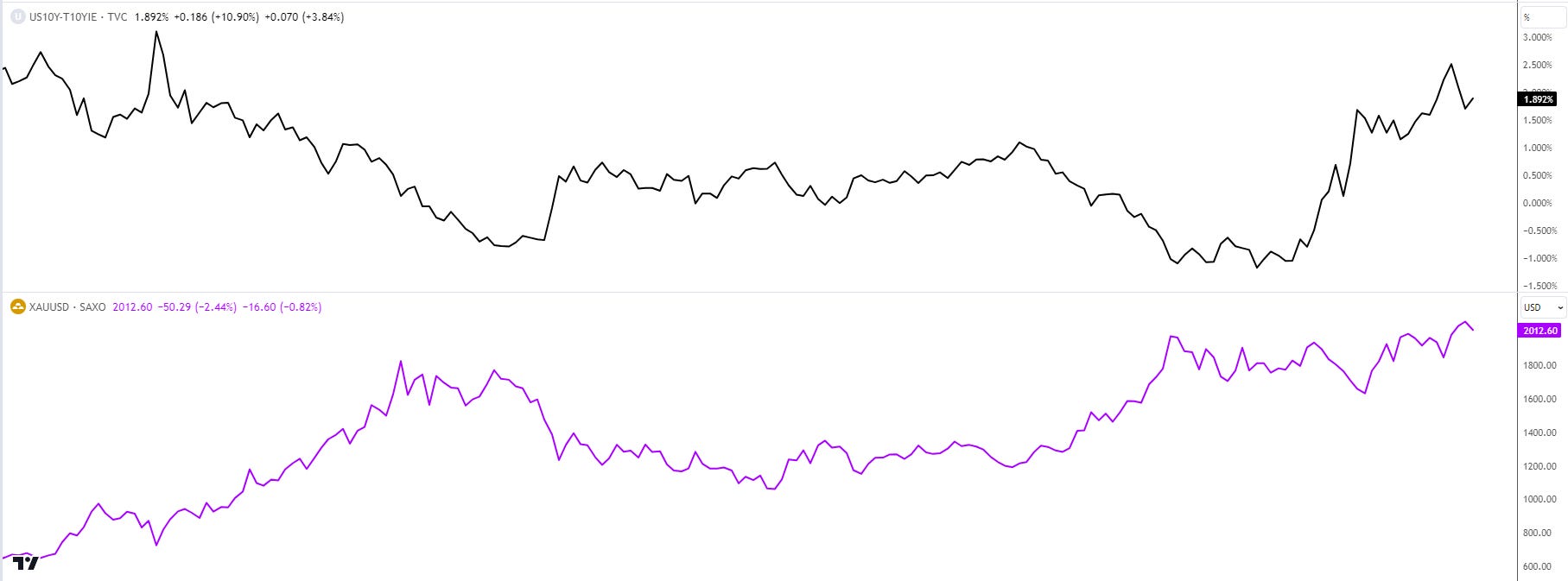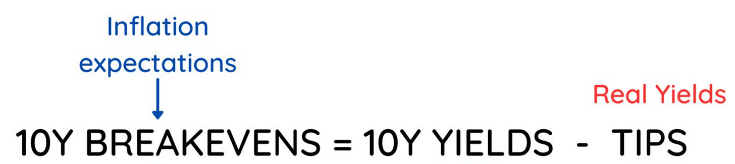 Another important indicator of gold is real rates which are calculated by subtracting 10Y breakevens from the 10Y nominal yields.