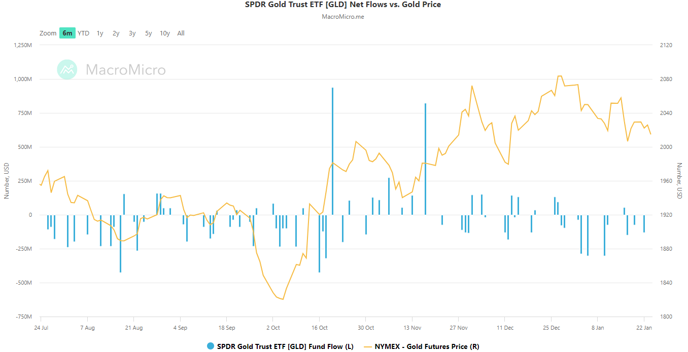 Recession prospects drive 10y bonds (risk-off pricing), yield falls. If the FED controls inflation, the second leg, inflation expectations, remains stable or falls. The important issue here is that the 1st leg of the equation (10y yield) falls more than the 2nd leg (inf exp). To see lower real rates, the distortion on the growth side should be higher than the progress on the inflation side. Considering recent inflation data which partially pushed the first rate cut expectations from March to May, we might expect this scenario to become real.The last point that I want to emphasize is the SPDR Gold Trust ETF [GLD] Net Flows :