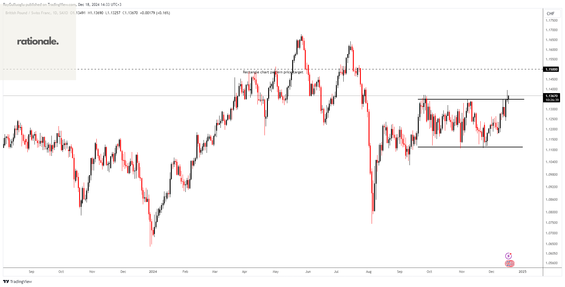 The Bank of England (BoE) is likely to maintain higher rates to combat persistent inflationary pressures, while the Swiss National Bank (SNB) remains dovish, with potential rate cuts on the horizon due to low inflation and stable growth. This contrast underscores the relative strength of the pound over the franc, as the BoE's tighter policy stance supports GBP appreciation. With the SNB signaling a more accommodative path, the rate divergence might favor GBP/CHF upside potential.