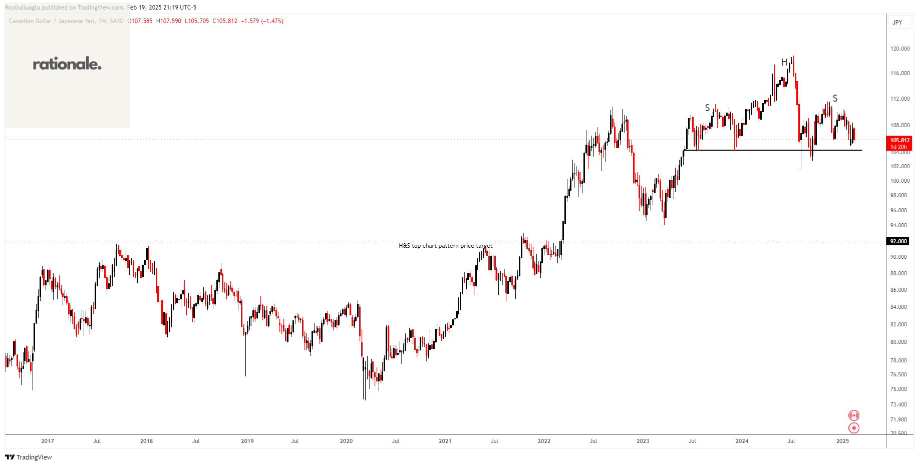 Despite January’s inflation spike potentially delaying rate cuts, CAD remains vulnerable due to tariff sensitivity and expectations of declining oil prices. Rate cuts are still likely as uncertainty persists. Meanwhile, JPY is supported by its ongoing hiking path and stronger-than-expected growth, reinforcing a bearish outlook for CADJPY.