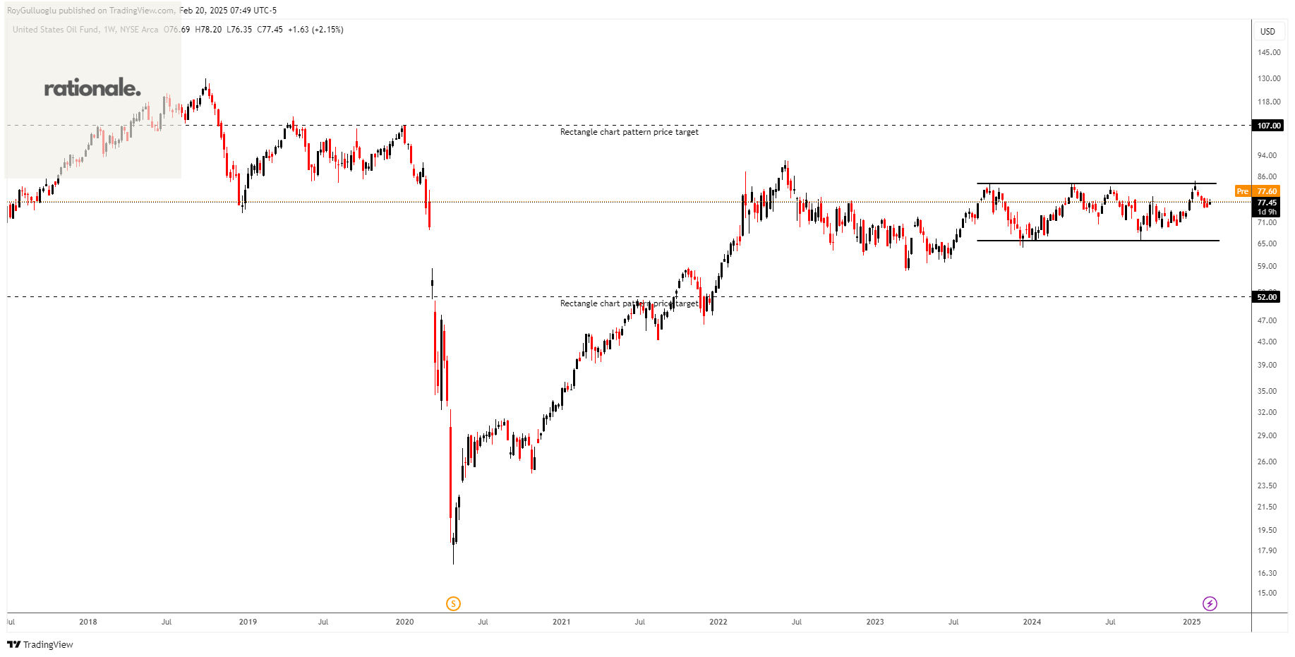 The above daily USO chart formed an approximately 3-month-long rectangle chart pattern as a bearish reversal or bullish continuation after an uptrend.