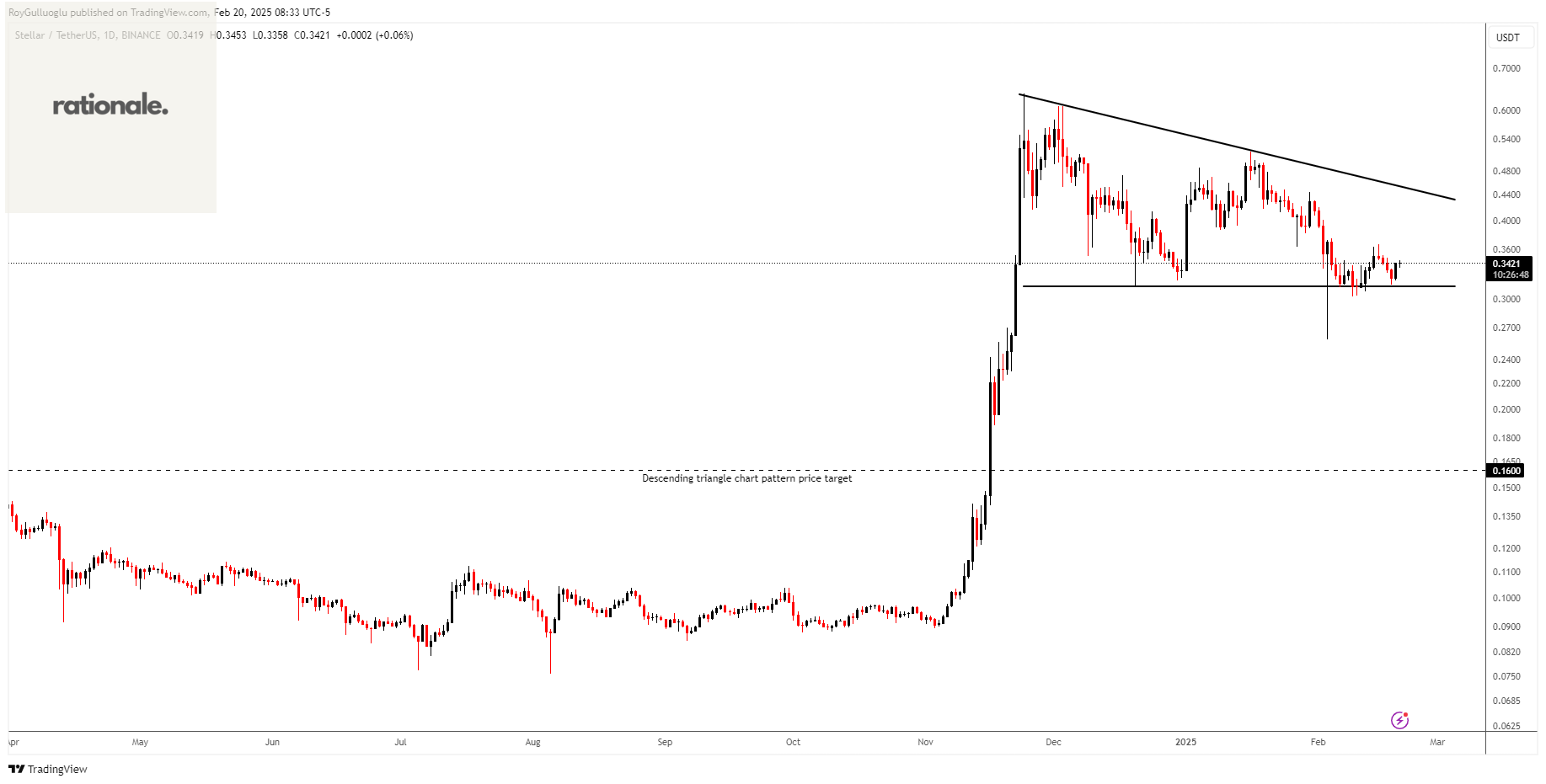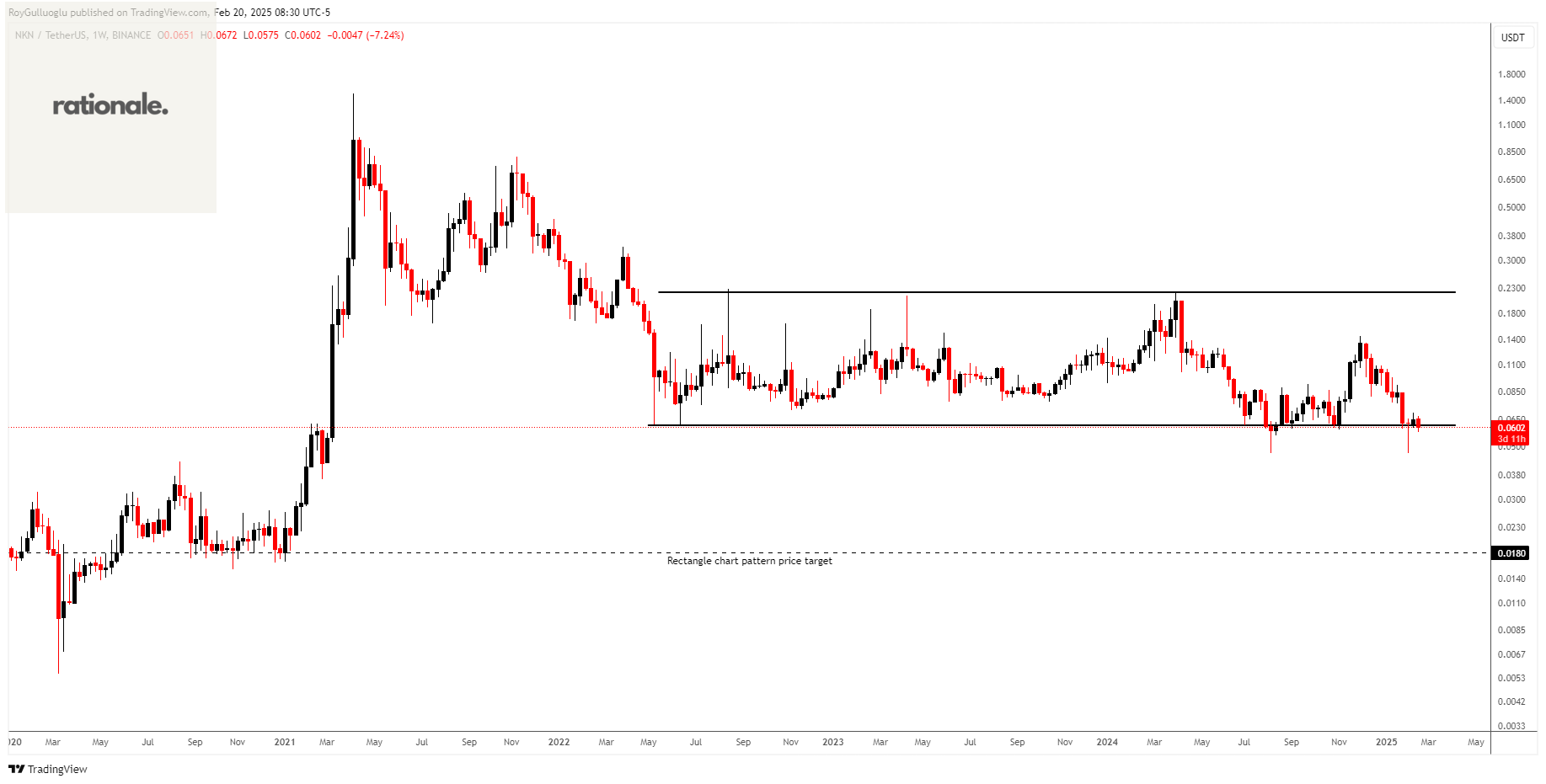 A daily close below 0.058 levels would validate the breakdown from the 36-month-long rectangle chart pattern.