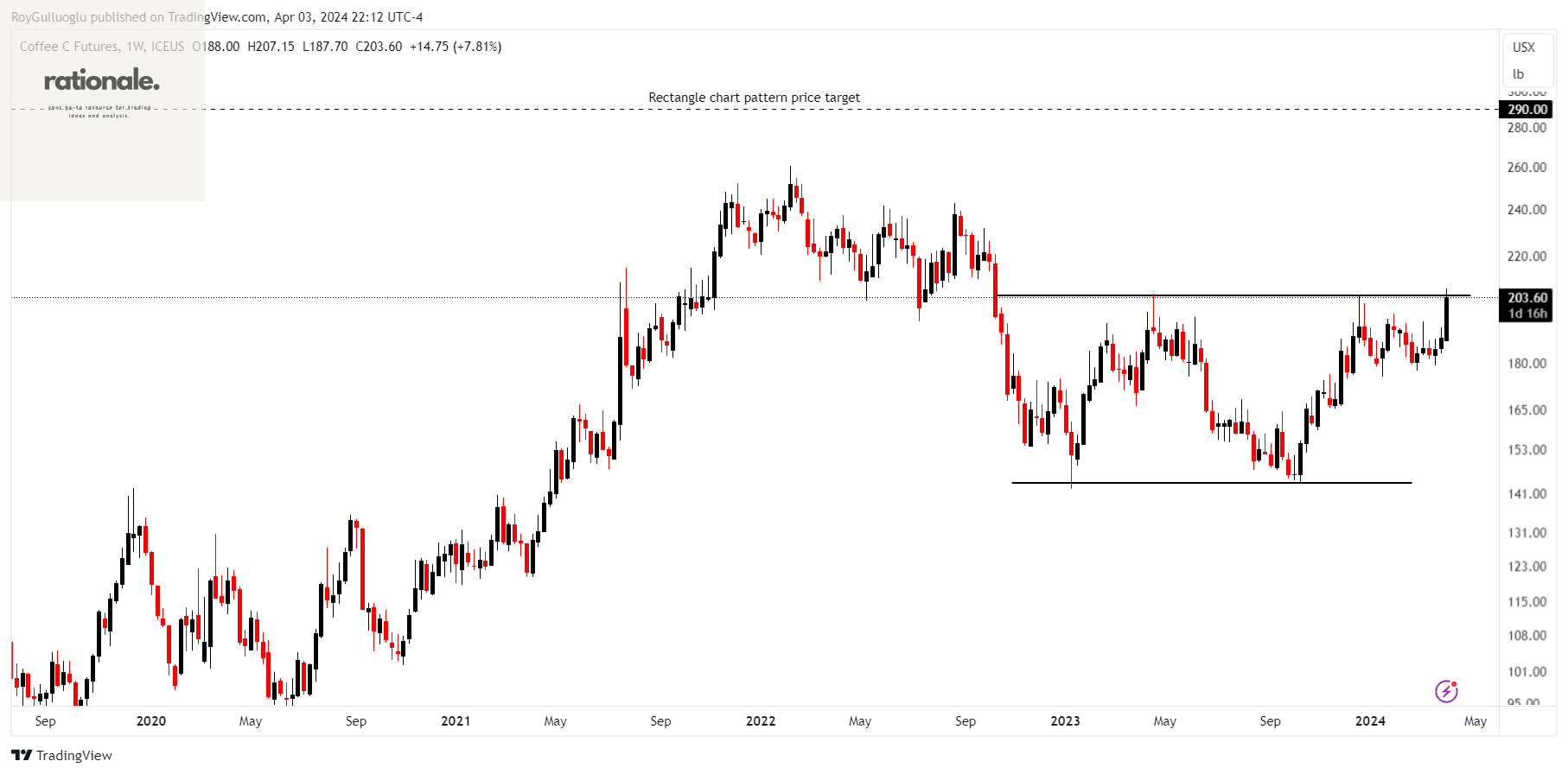 A daily close above 210.4 levels would validate the breakout from the 19-month-long rectangle chart pattern.