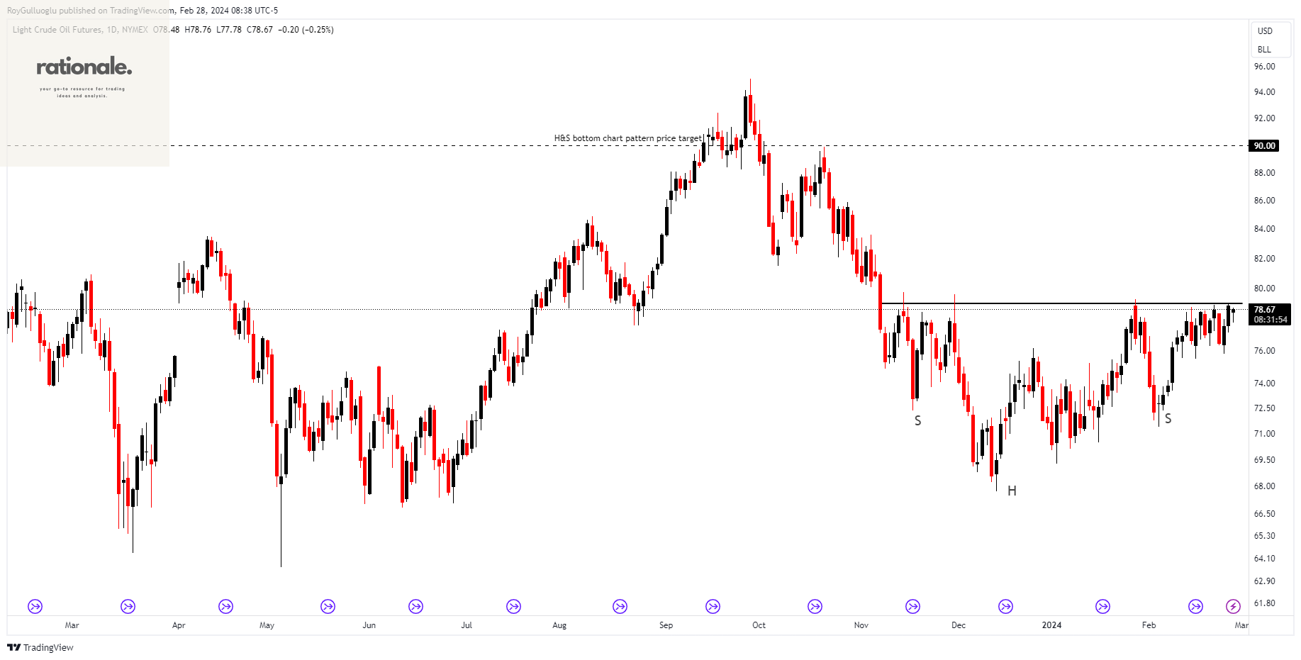 A daily close above 80.18 levels would validate the breakout from the 3-month-long H&S bottom chart pattern.